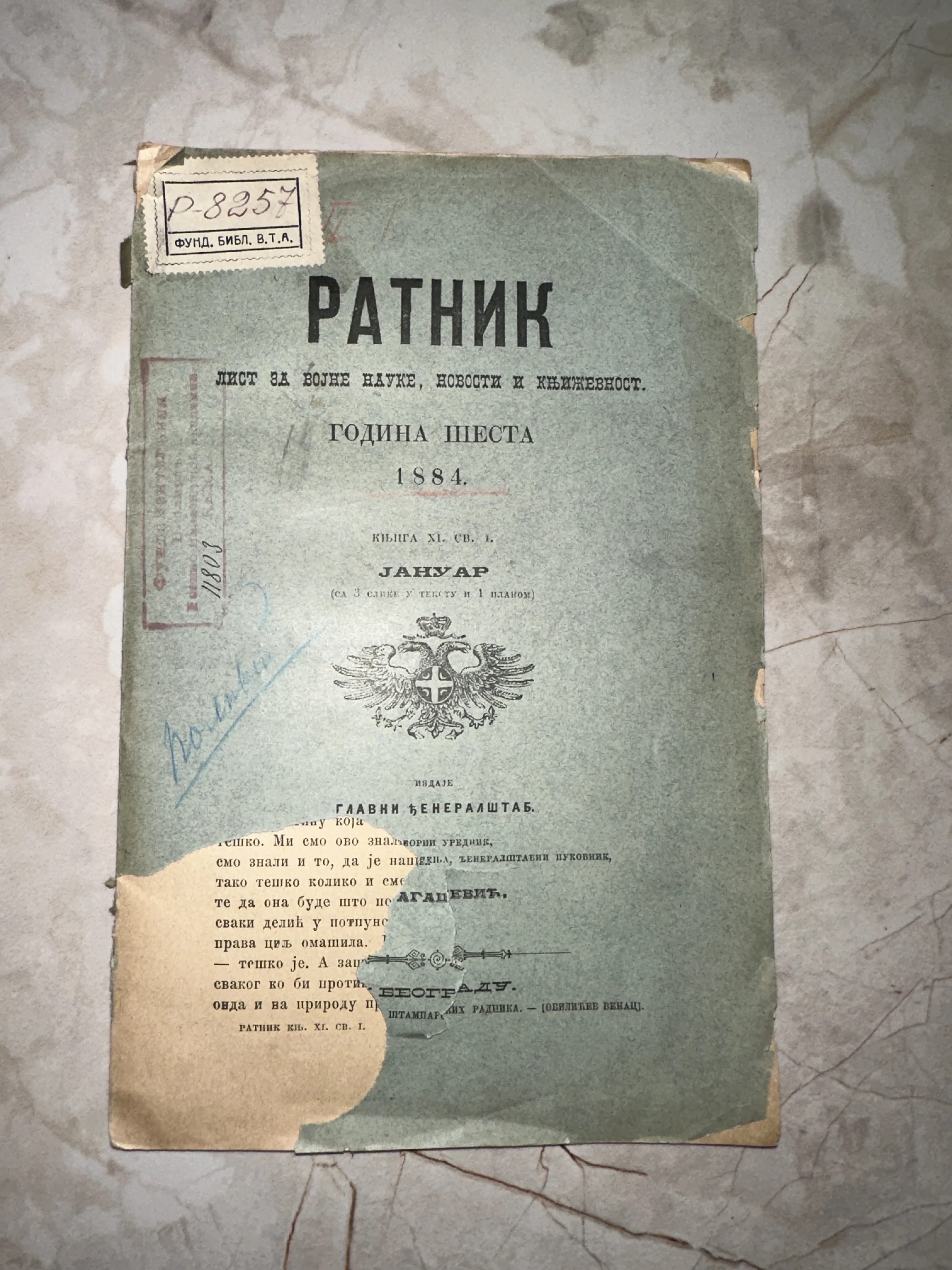 Редкий экземпляр сербского военного периодического издания, выпущенного Главным Генеральным штабом в Белграде. На голубоватой обложке сохранился величественный двуглавый орел и подлинные библиотечные пометки, свидетельствующие о богатой истории этого документа. Это не просто журнал, а ценный артефакт эпохи, сохранивший дух балканской военной мысли XIX века.