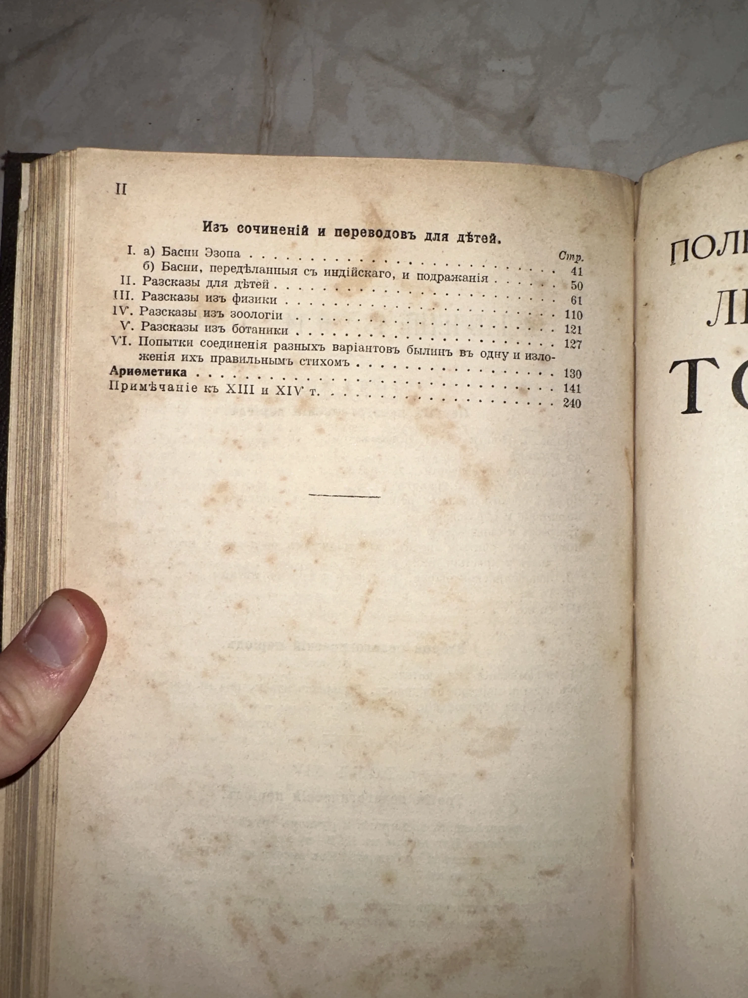 Уникальный разворот антикварного тома с перечнем произведений великого классика, напечатанный в дореволюционной орфографии. Желтоватая бумага с характерными следами времени и «лисьими пятнами» подчеркивает подлинность и почтенный возраст этого библиографического артефакта. Издание представляет особую ценность для коллекционеров русской классики и исследователей педагогического наследия Толстого.