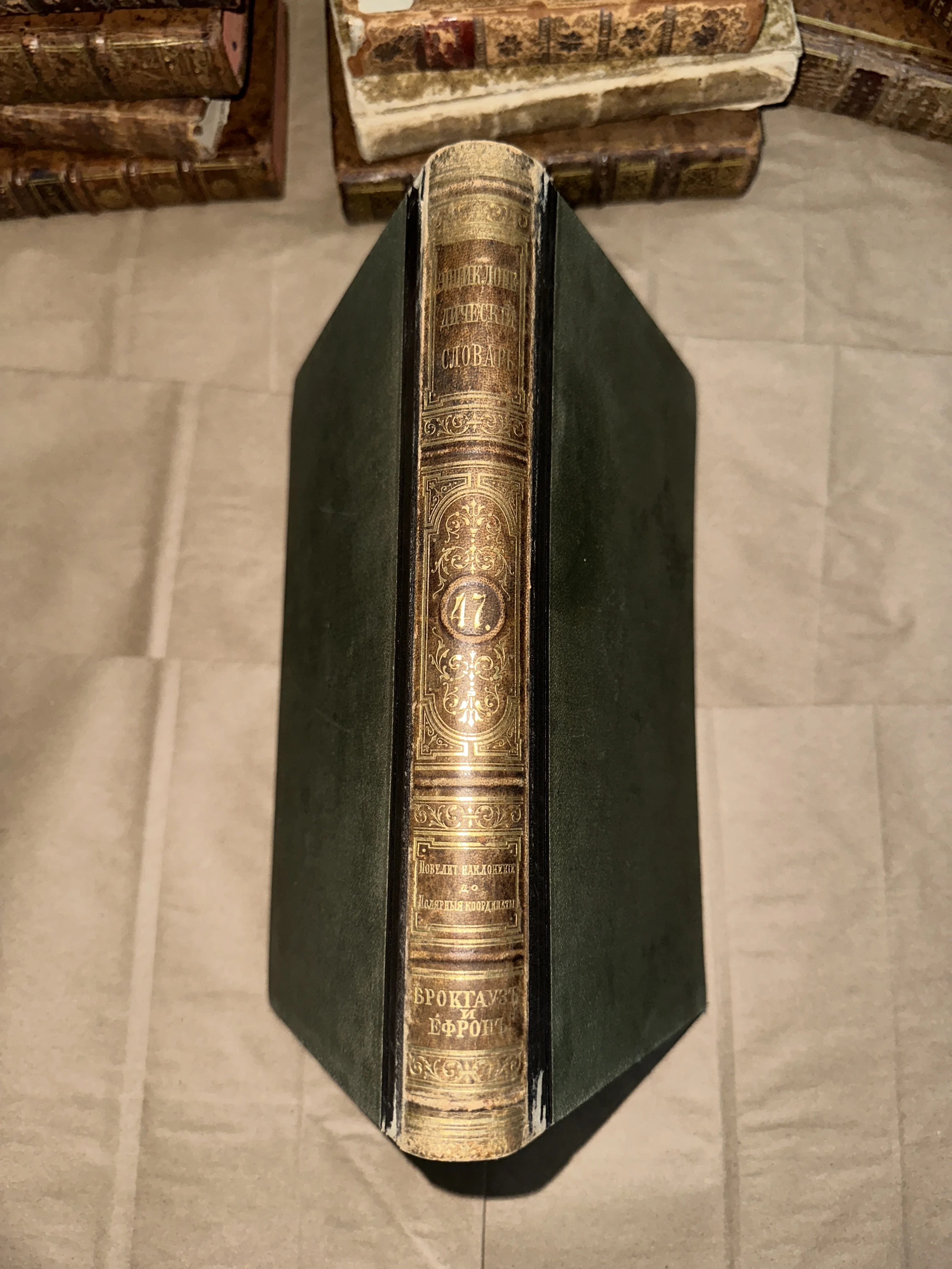 Корешок антикварной книги с золотым тиснением, номер тома 47, издательство Брокгауз и Ефрон.