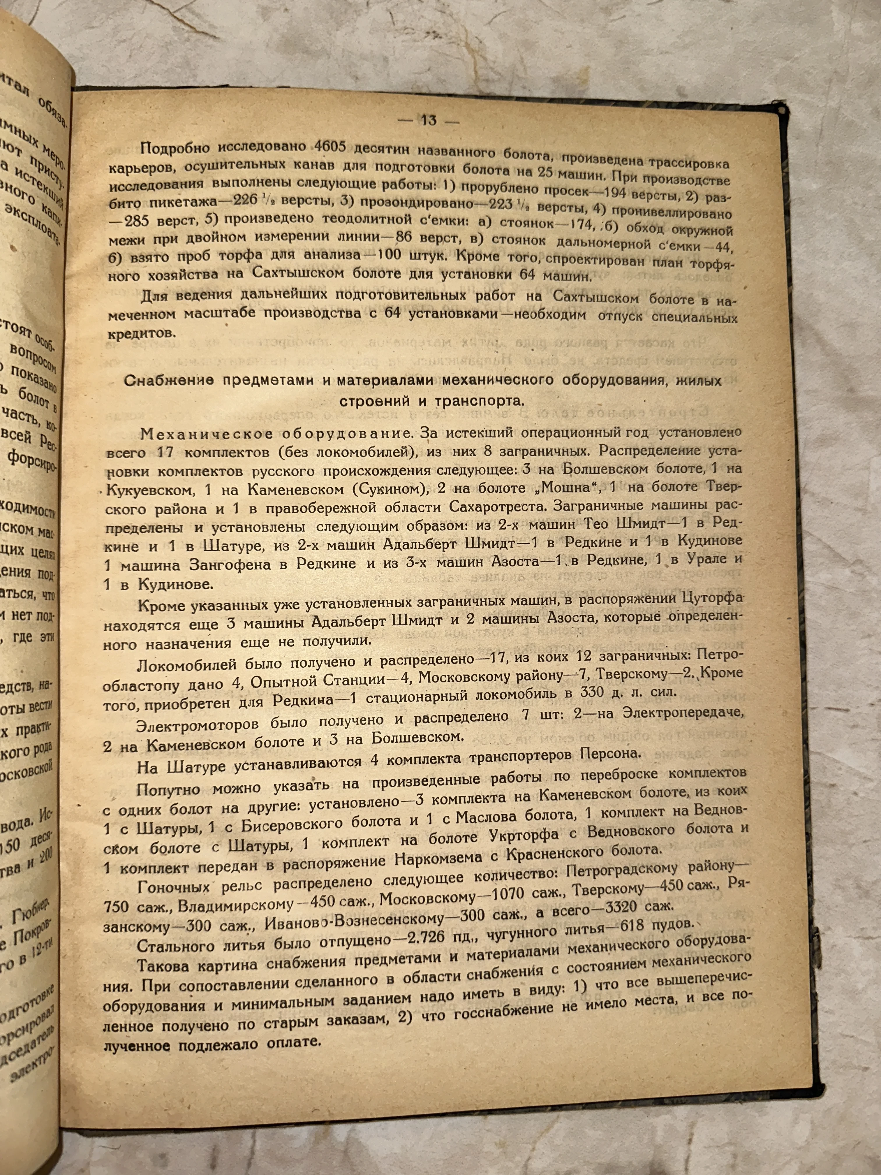Уникальный документ эпохи ранней индустриализации, детально описывающий процесс мелиорации и распределение импортной техники. Пожелтевшая бумага с четкой типографской печатью сохранила дух времени и масштабность советских хозяйственных планов. Текст представляет особую ценность для историков техники и исследователей промышленного освоения торфяников.