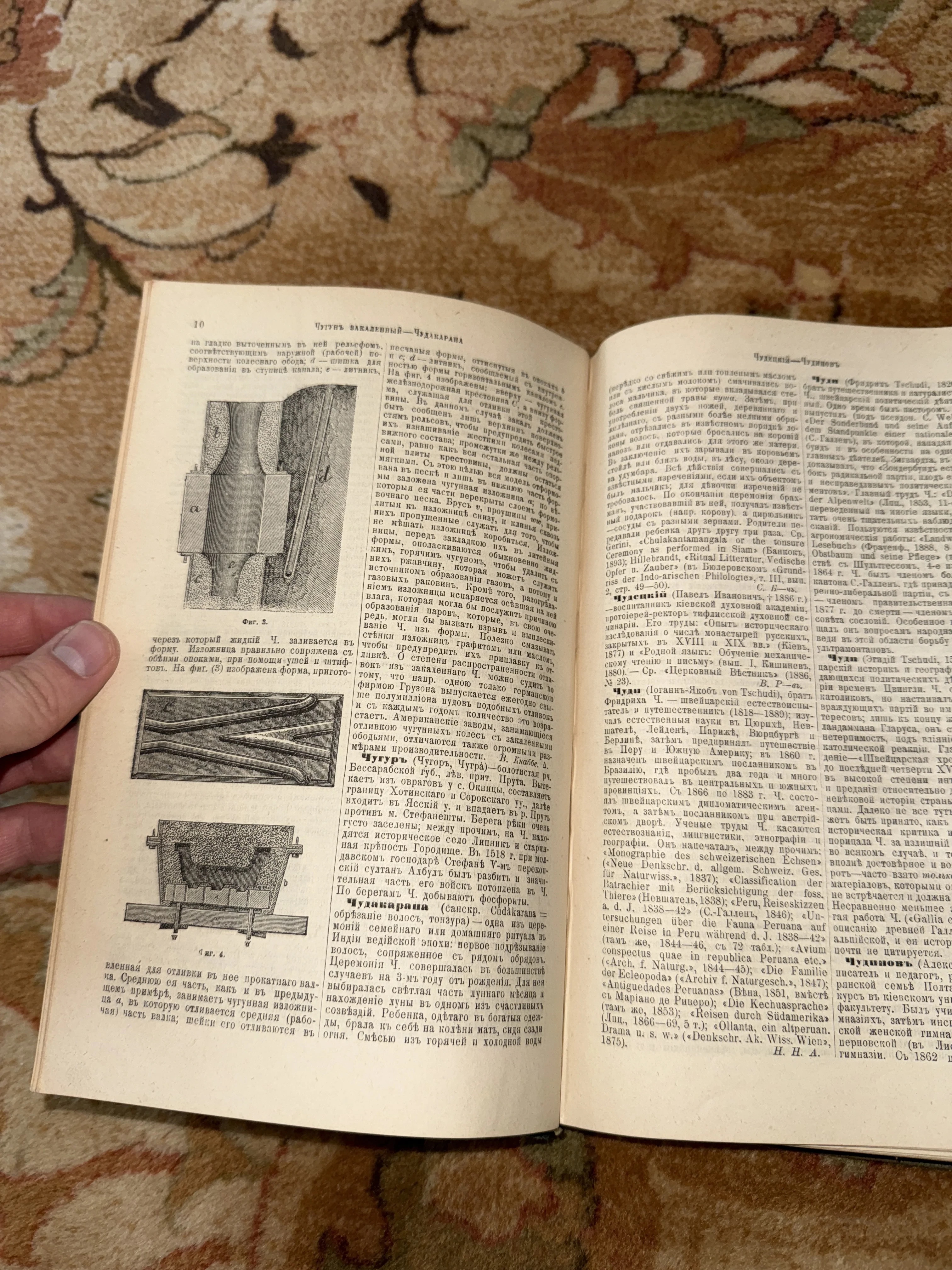 Этот редкий разворот представляет собой живое свидетельство научной мысли прошлых веков, где соседствуют детальные чертежи литейных форм и энциклопедические статьи. Характерная типографика с использованием ятей и филигранная прорисовка технических схем подчеркивают аутентичность и высокую ценность издания. Книга сохранила естественную патину времени, придающую страницам благородный кремовый оттенок и особую коллекционную атмосферу.