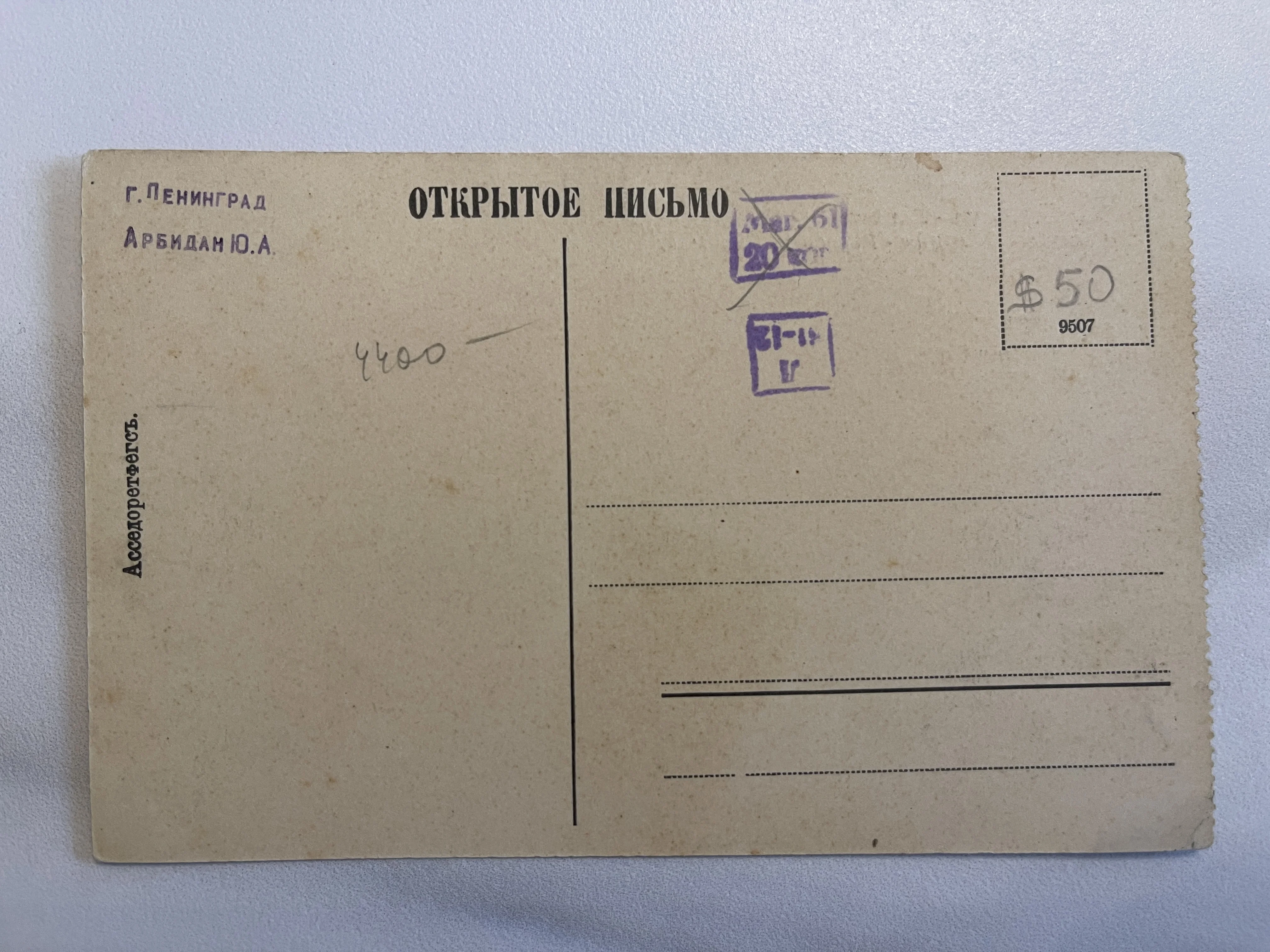 Аутентичный экземпляр почтового отправления из Ленинграда с характерной типографикой и фиолетовыми штемпелями эпохи. Пожелтевшая от времени бумага и следы карандашных пометок придают предмету особую историческую ценность, превращая обычную карточку в живое свидетельство прошлого.