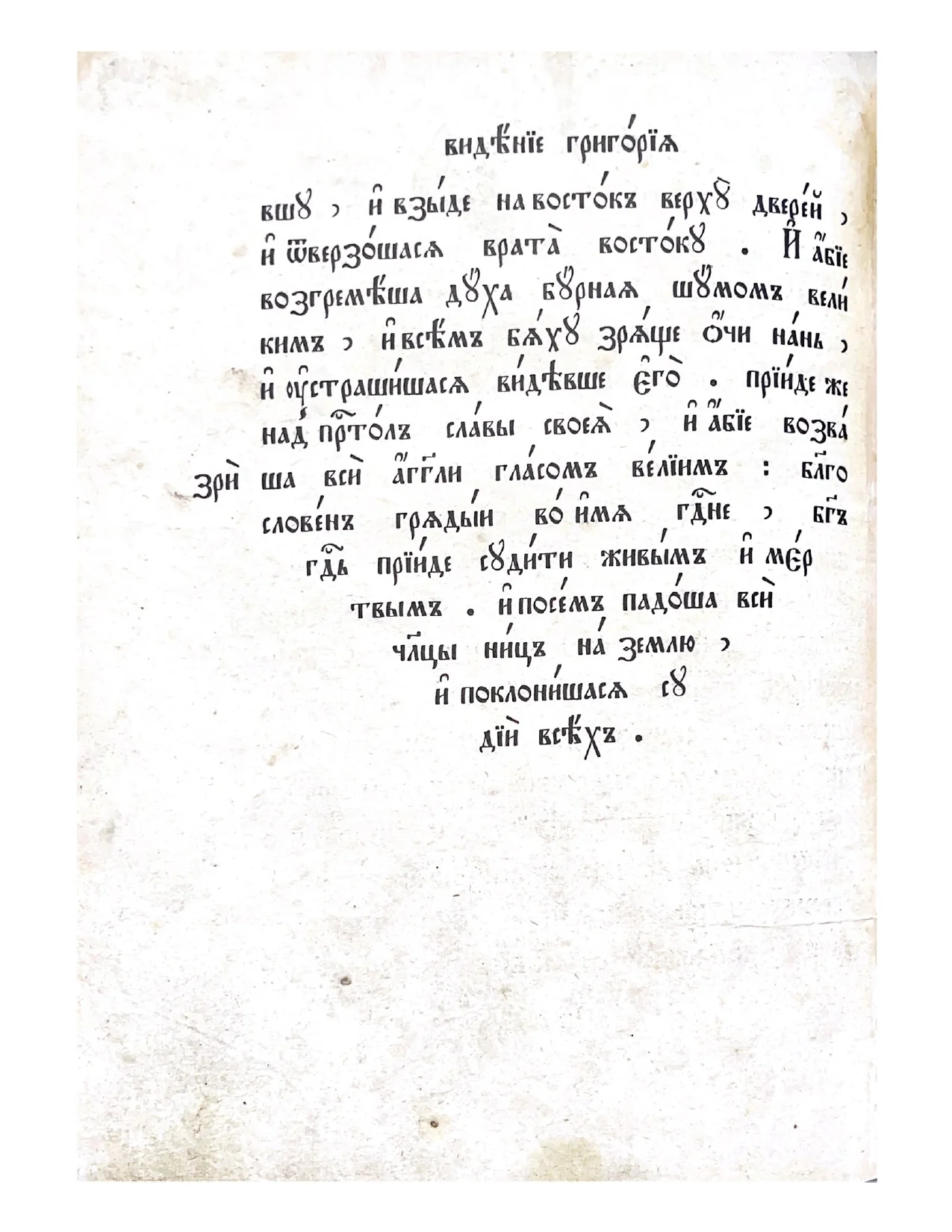 Текст на церковнославянском языке, озаглавленный Видение Григория, на пожелтевшей бумаге.