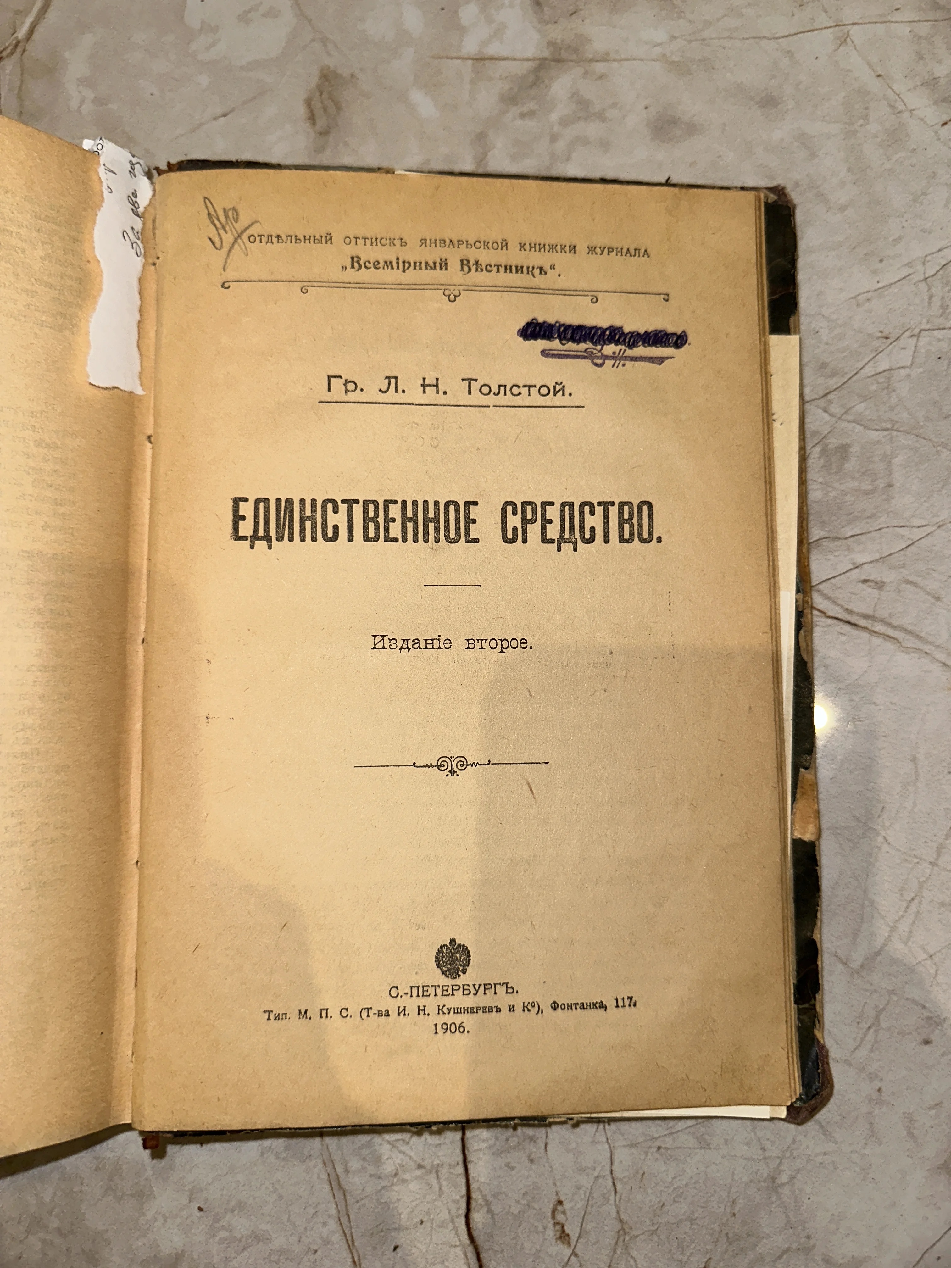 Титульный лист антикварной книги Льва Николаевича Толстого «Единственное средство», оттиск журнала Всемирный Вестник, 1906 год.