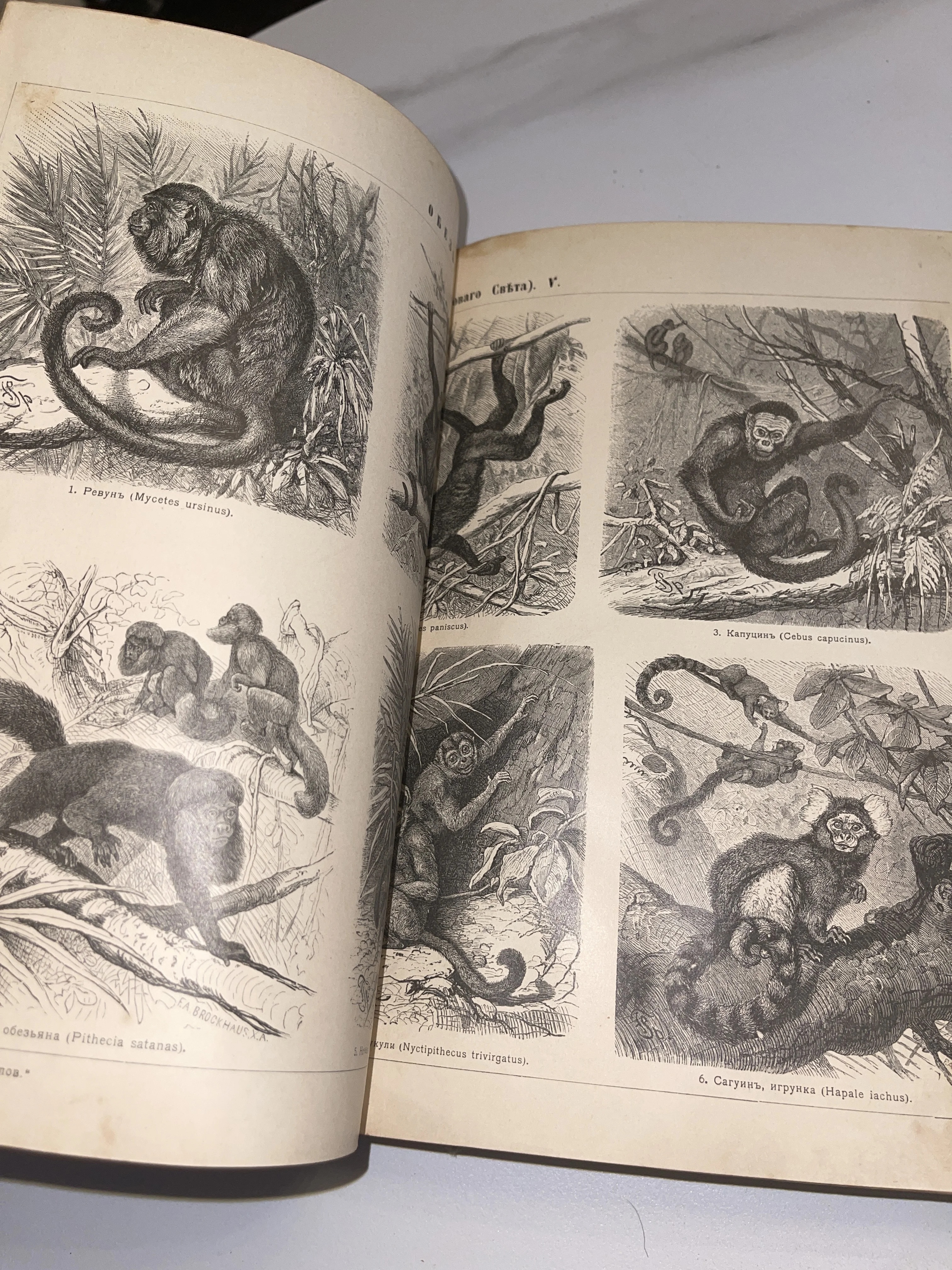 Разворот антикварной книги с детализированными черно-белыми гравюрами приматов и подписями на дореволюционном русском языке.