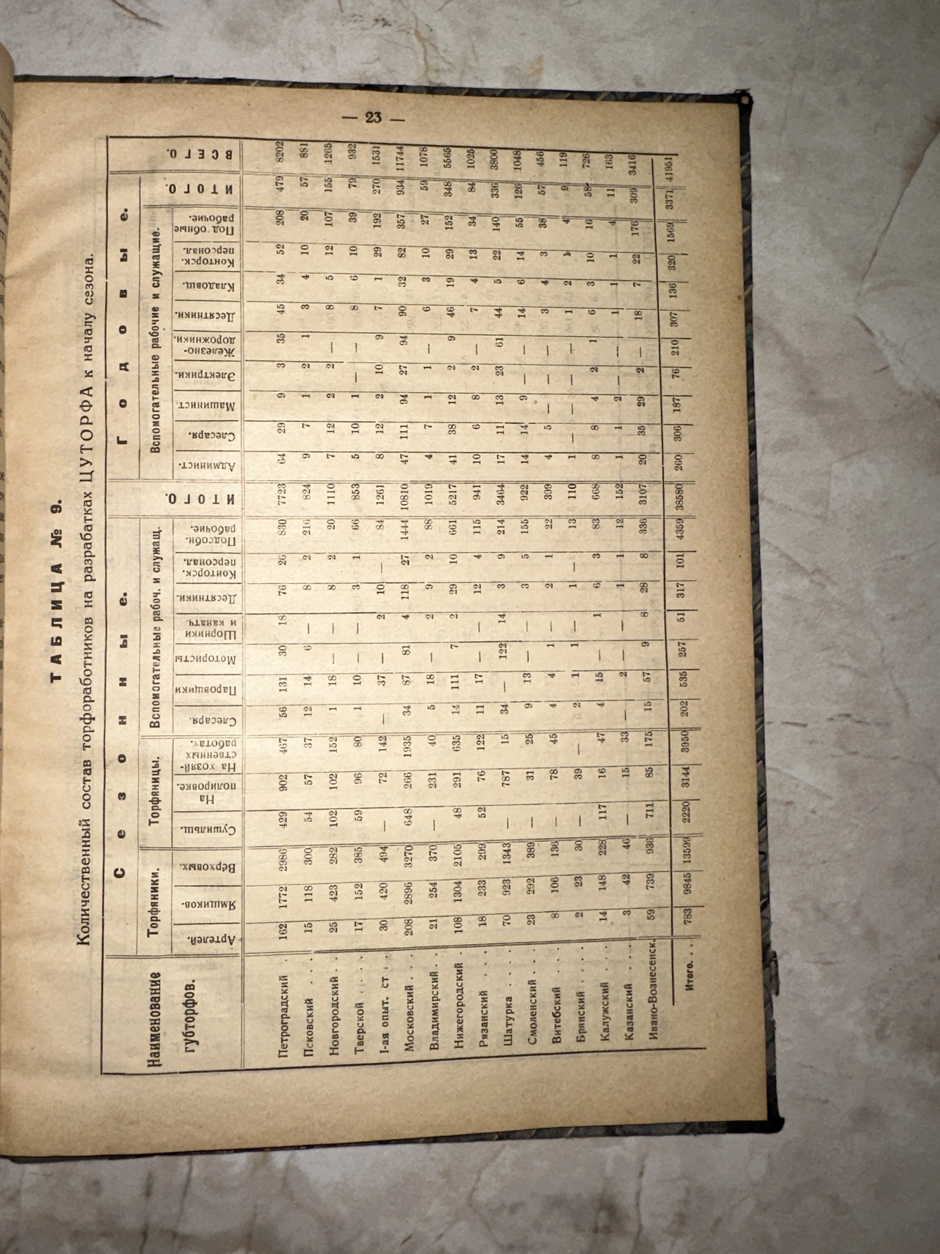 Перед вами подлинный фрагмент промышленной истории начала XX века — детализированный статистический отчет о трудовых ресурсах торфяной отрасли. Пожелтевшая от времени бумага и четкая типографская верстка сохранили дух эпохи великих индустриальных преобразований. Этот документ представляет исключительный интерес для коллекционеров ведомственных изданий и исследователей экономической истории.