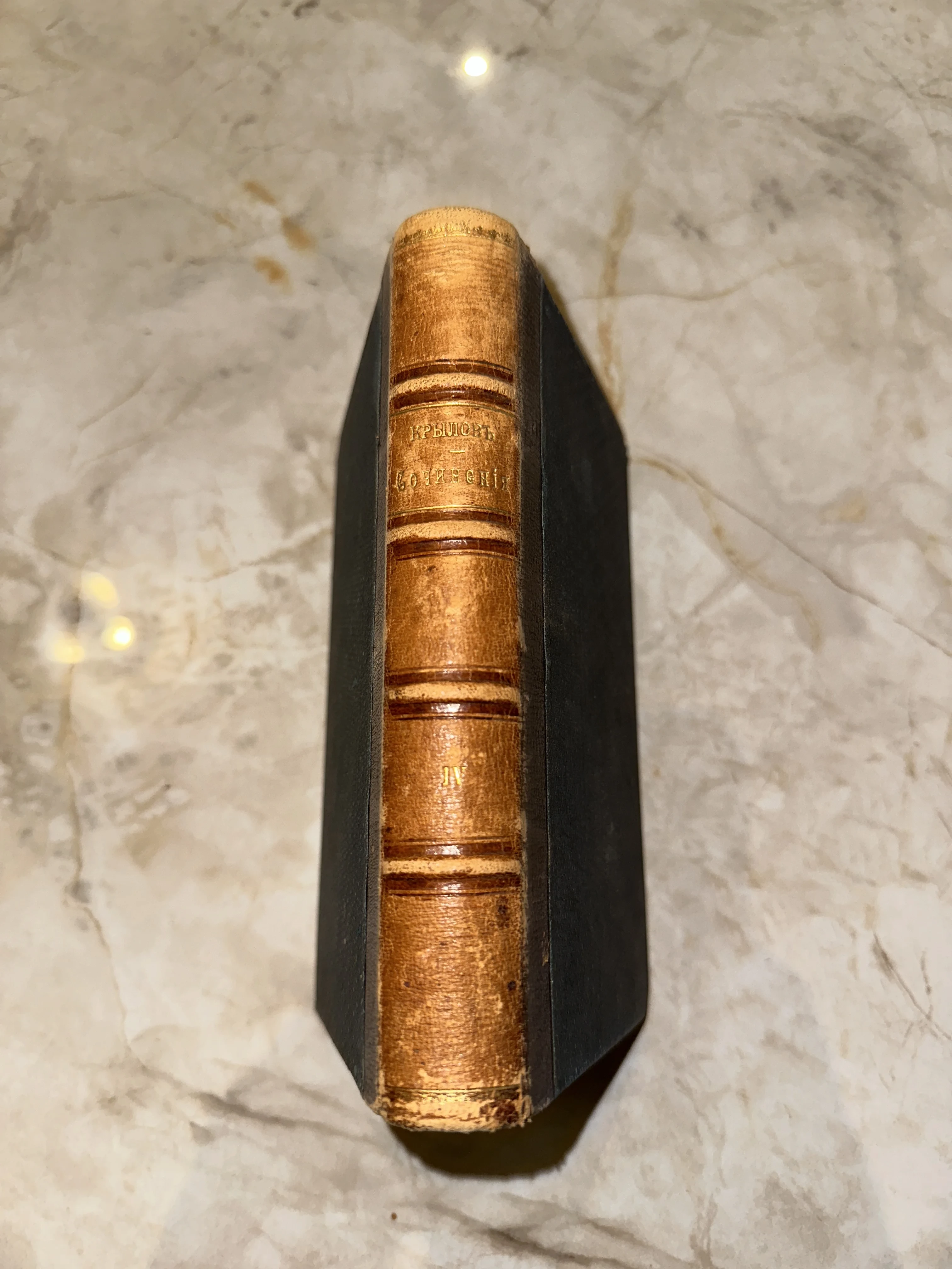 Кожаный корешок антикварной книги И. А. Крылова «Сочинения», том 4, с золотым тиснением на мраморном фоне.