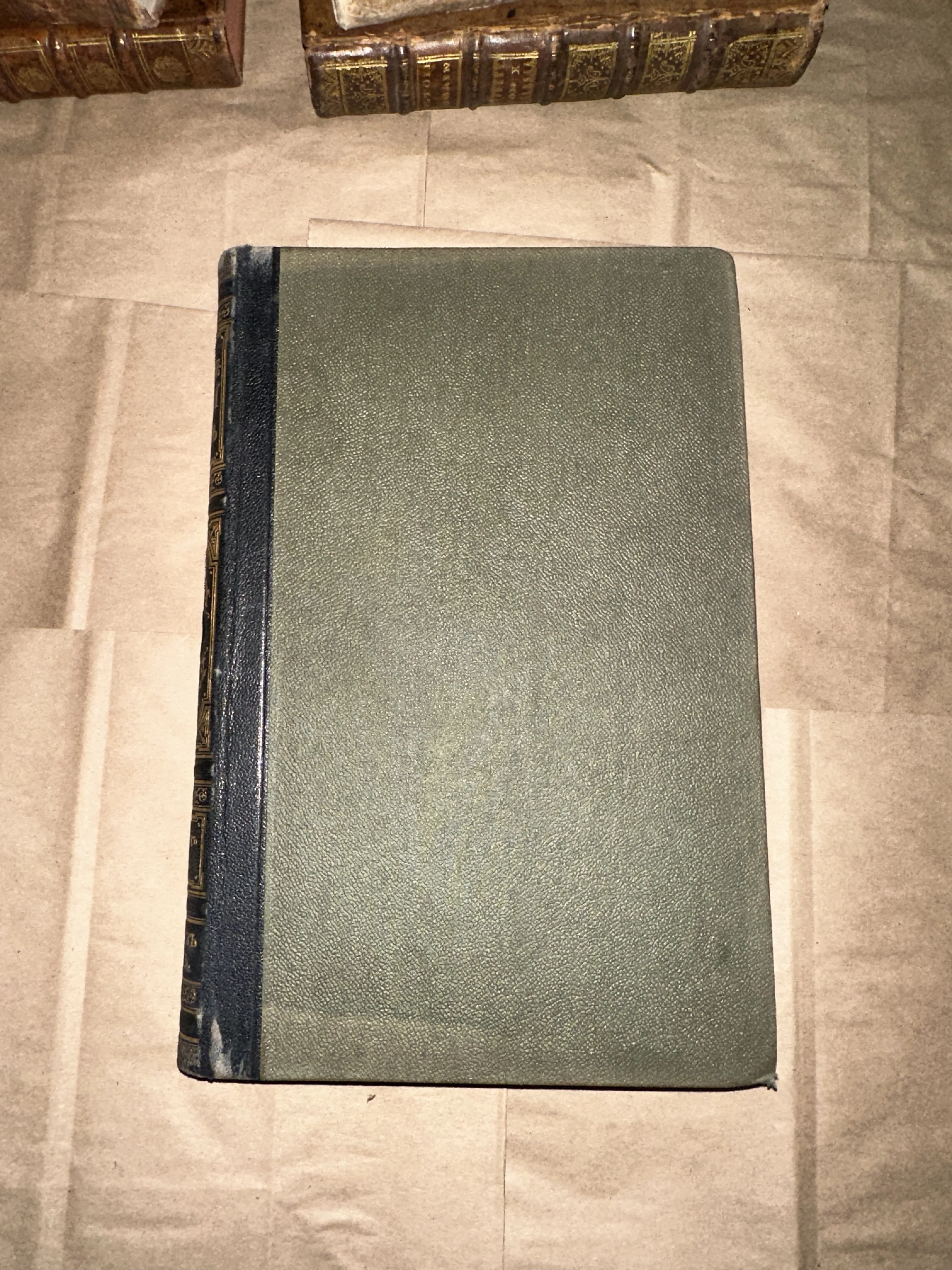 Вид сверху на антикварную книгу с зеленой фактурной обложкой и темным кожаным корешком с золотым тиснением на фоне упаковочной бумаги.