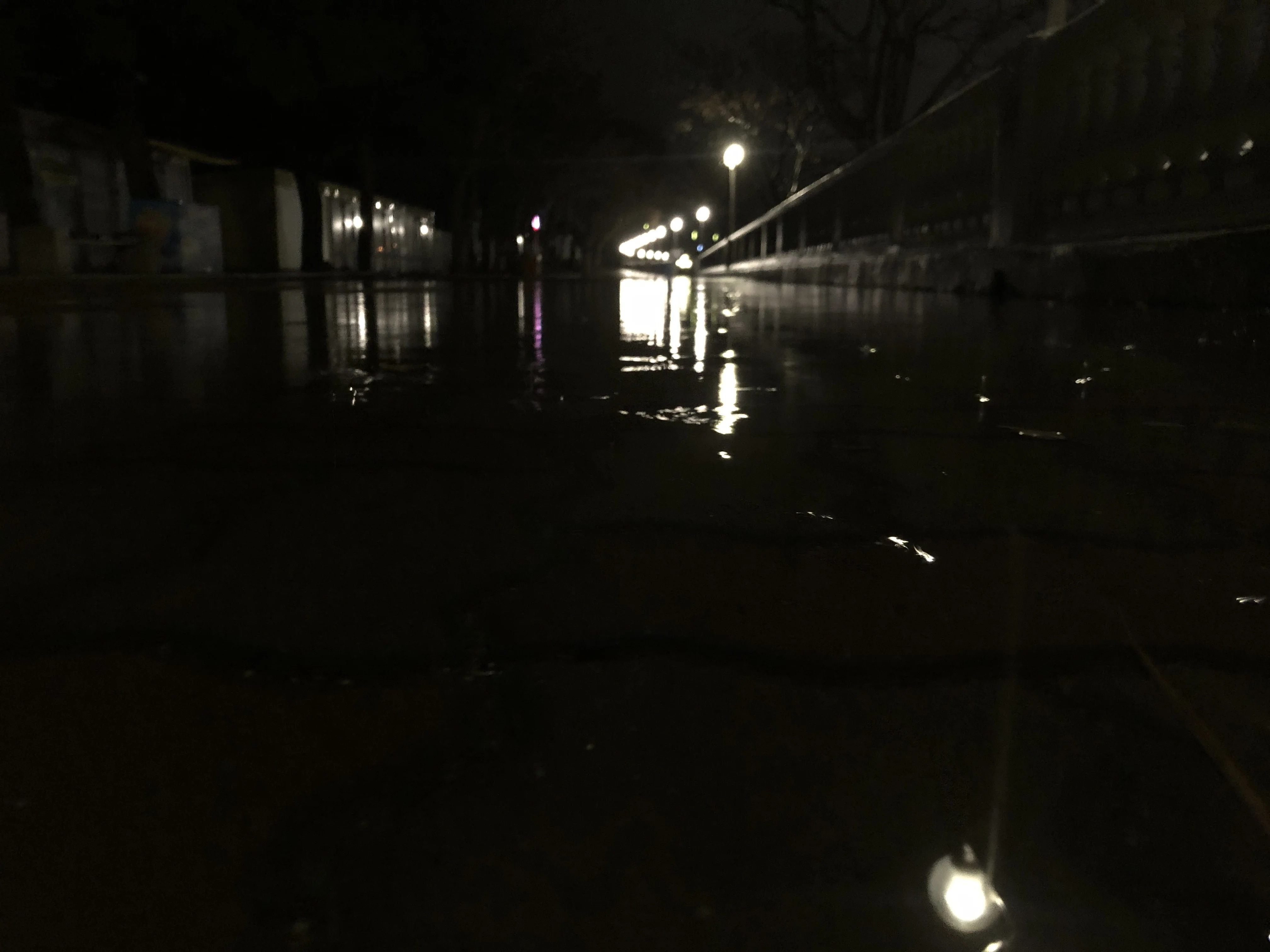 Отражение ярких уличных фонарей в лужах на мокром асфальте в темное время суток.