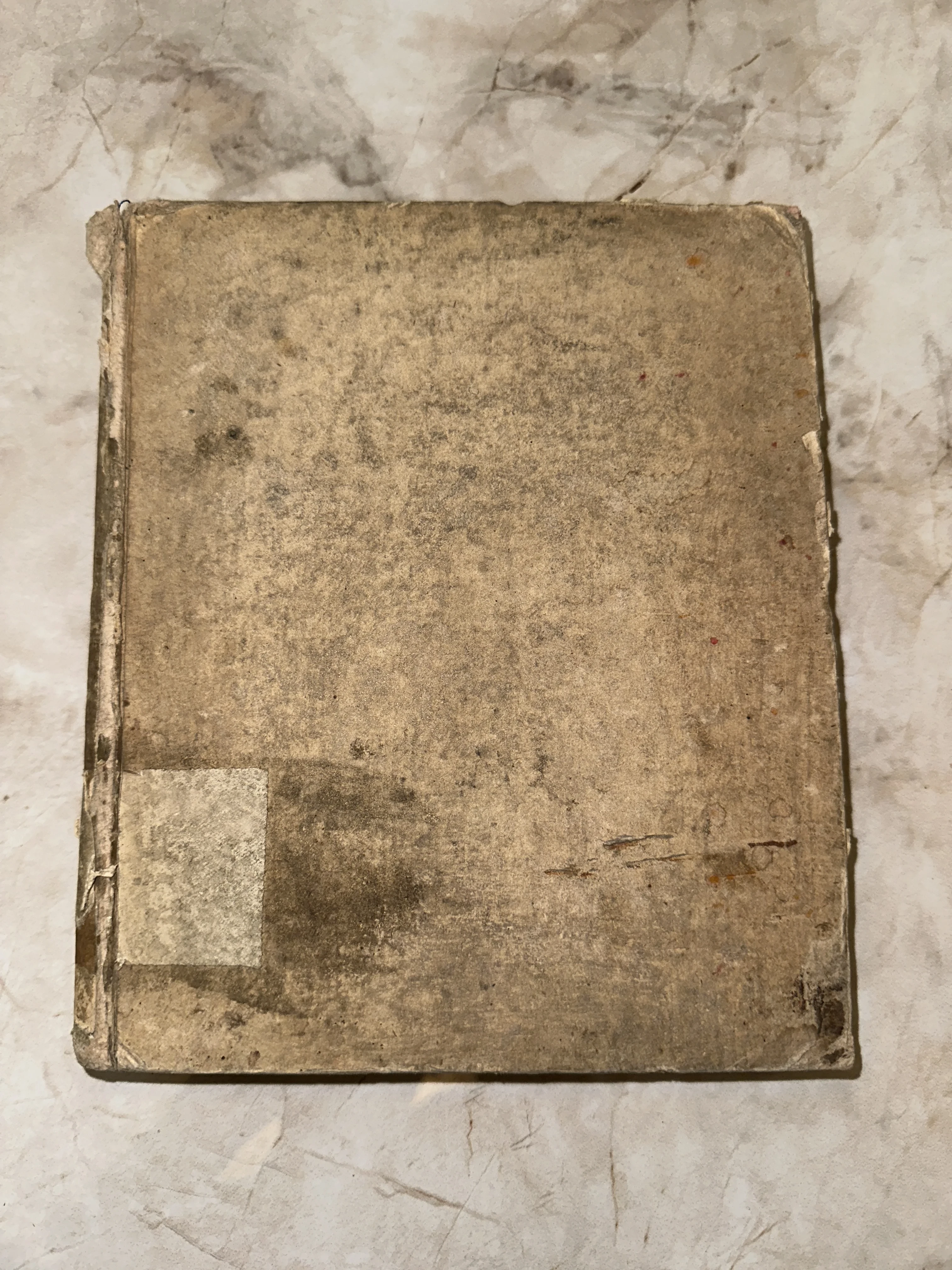 Вид сверху на обложку старинной антикварной книги с сильными потертостями, пятнами и следами бытования.