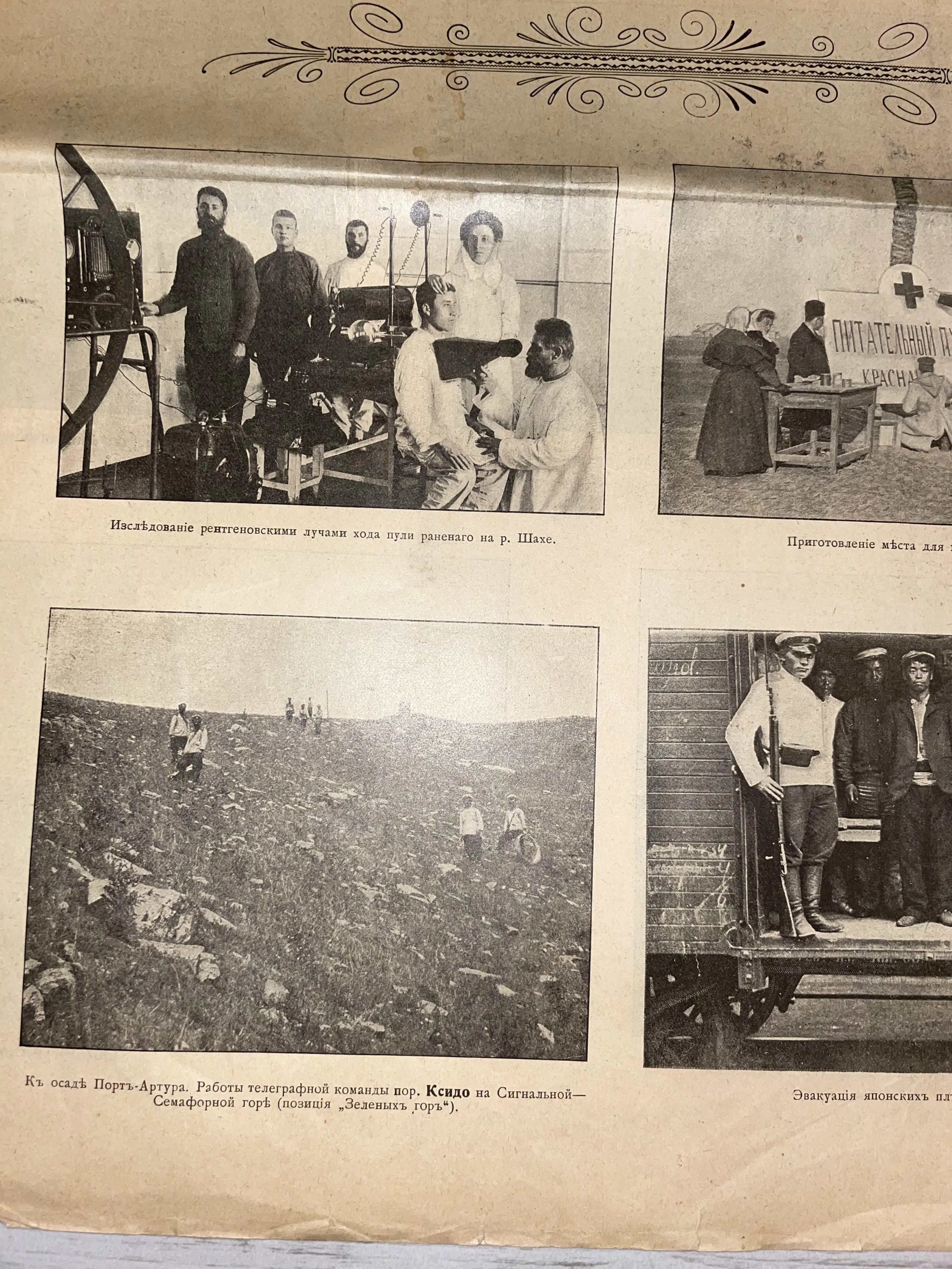 Страница старинного журнала с четырьмя черно-белыми фотографиями времен Русско-японской войны, включая рентгеновское обследование раненого и сцены из Порт-Артура.