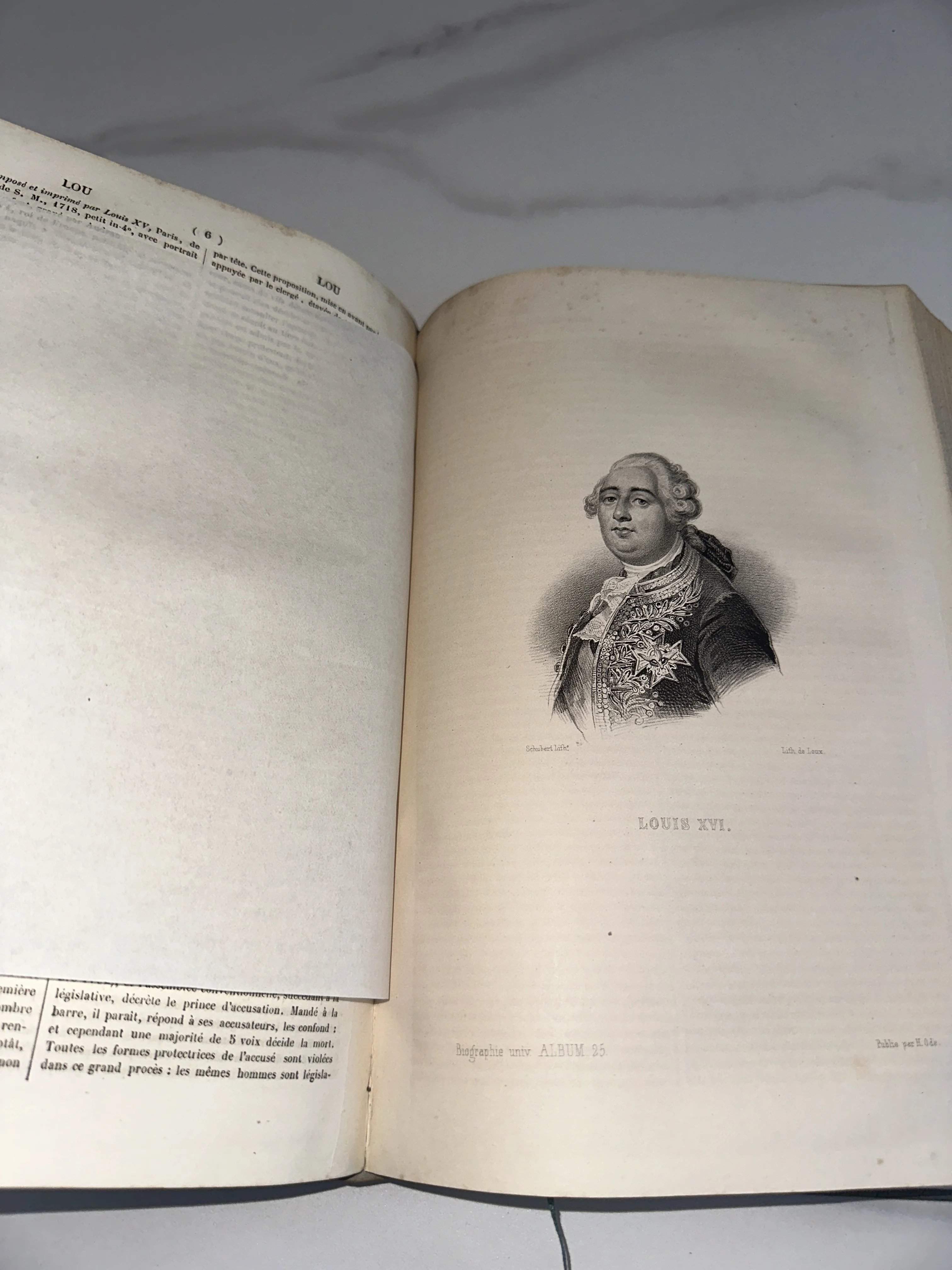 Старинная гравюра с портретом французского короля Людовика XVI на странице раскрытой антикварной книги.