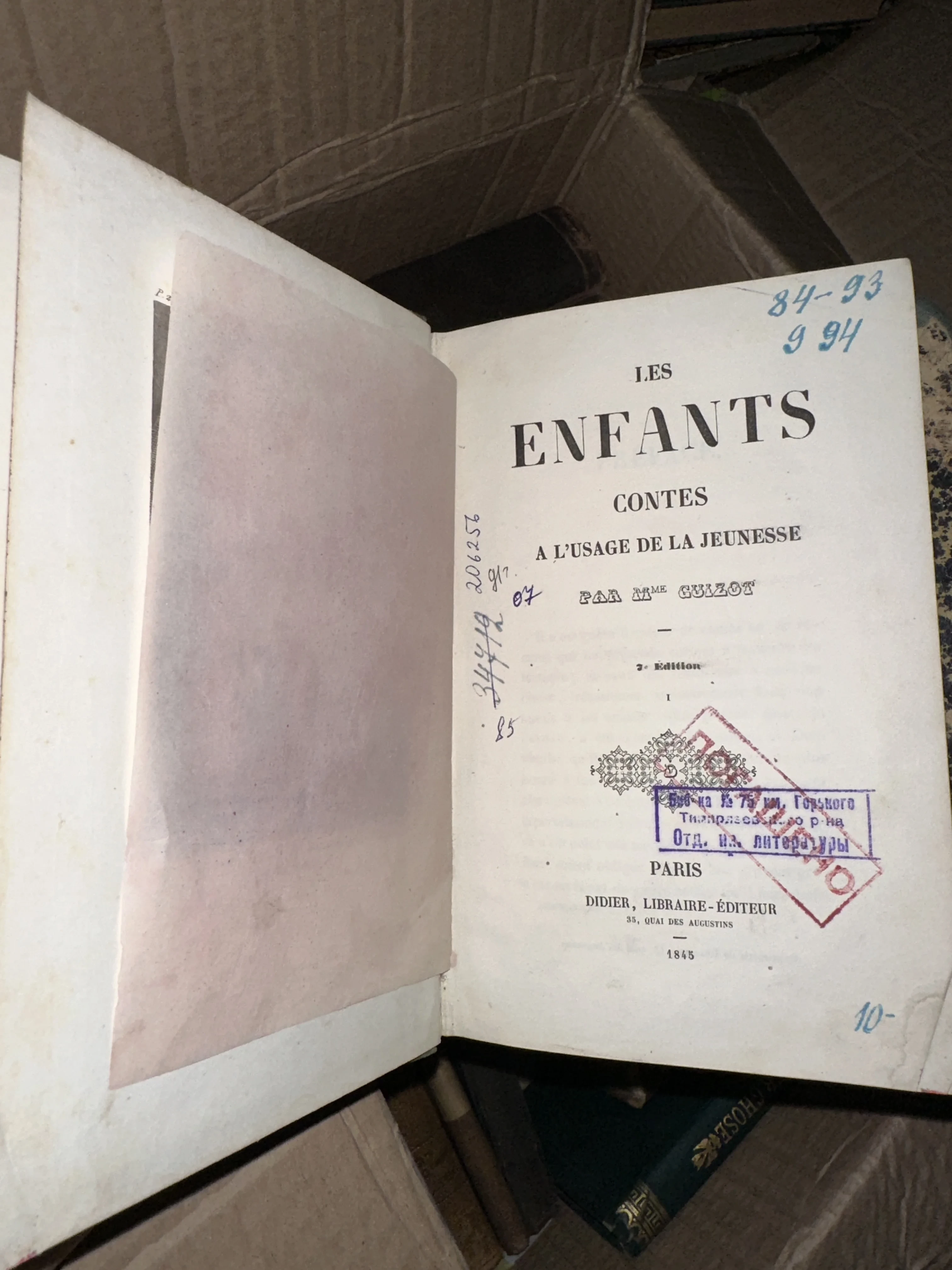 Редкий экземпляр седьмого парижского издания дидактических сказок для юношества авторства мадам Гизо. Книга представляет особый интерес для коллекционеров благодаря своей истории: на титульном листе сохранились оригинальные инвентарные пометки и штамп отдела иностранной литературы библиотеки имени Горького. Сохранность бумаги и наличие защитной папиросной вставки подчеркивают аутентичность этого артефакта середины XIX века.