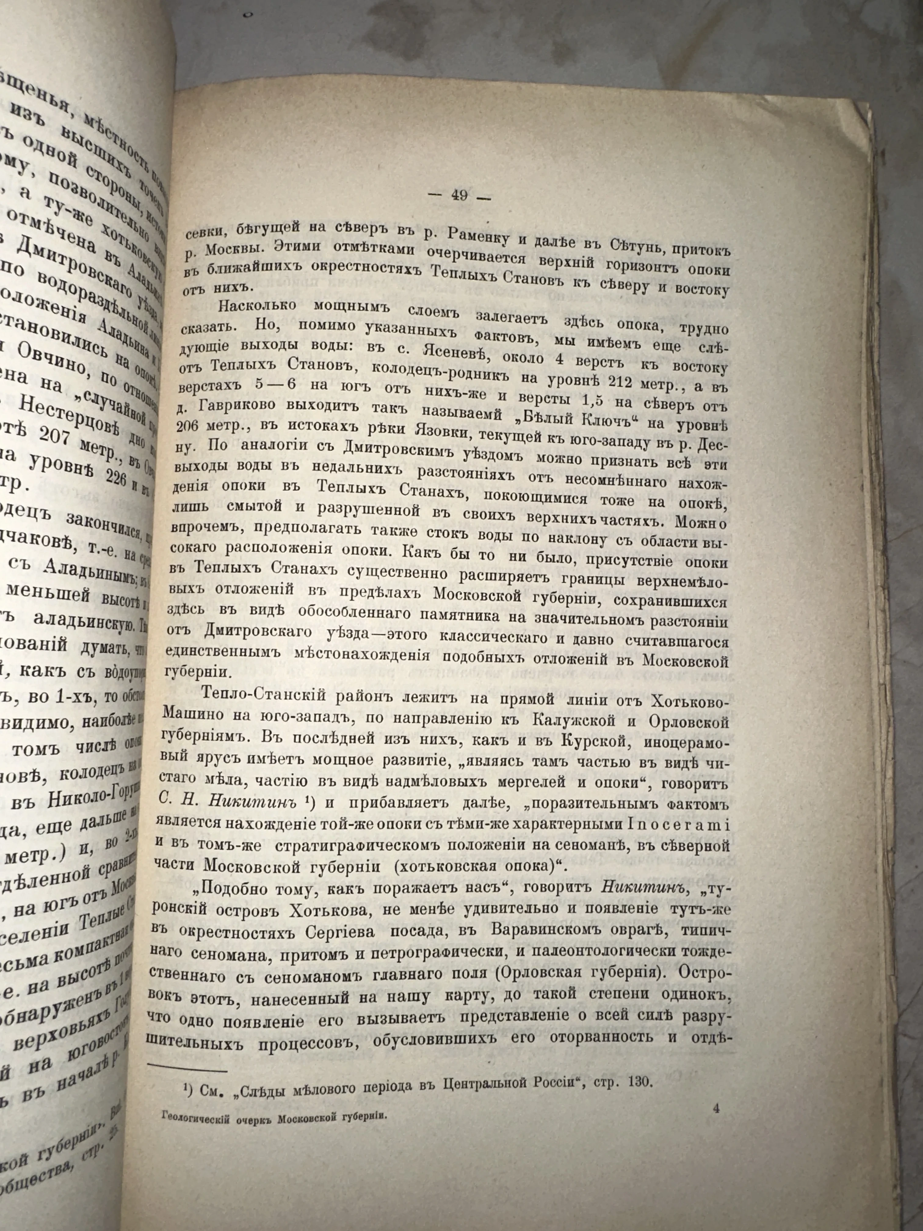 Разворот старинной книги с текстом в дореволюционной орфографии, описывающим геологию района Теплых Станов Московской губернии.