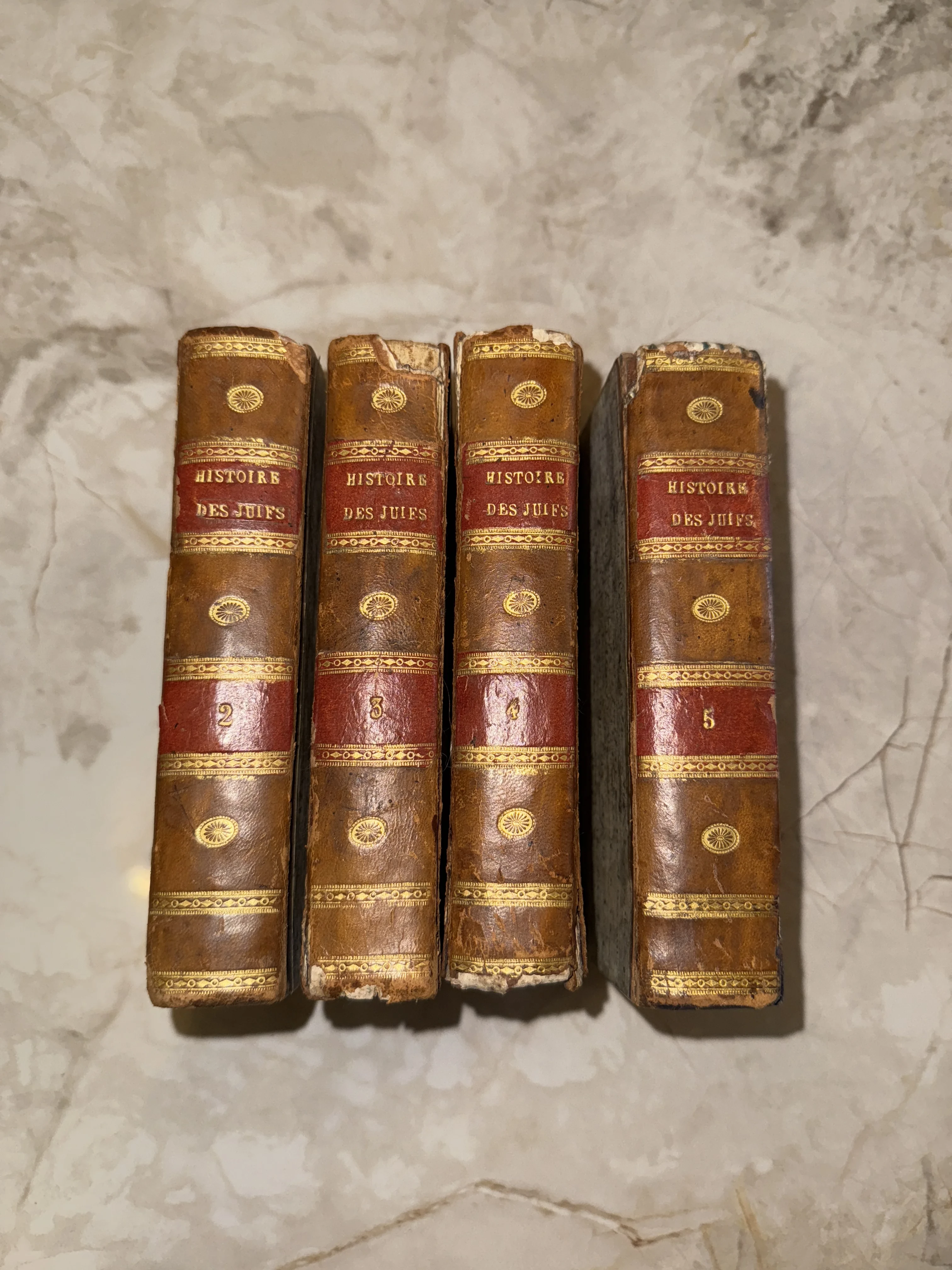 Четыре тома антикварной книги Histoire des Juifs в кожаном переплете с золотым тиснением на корешках.