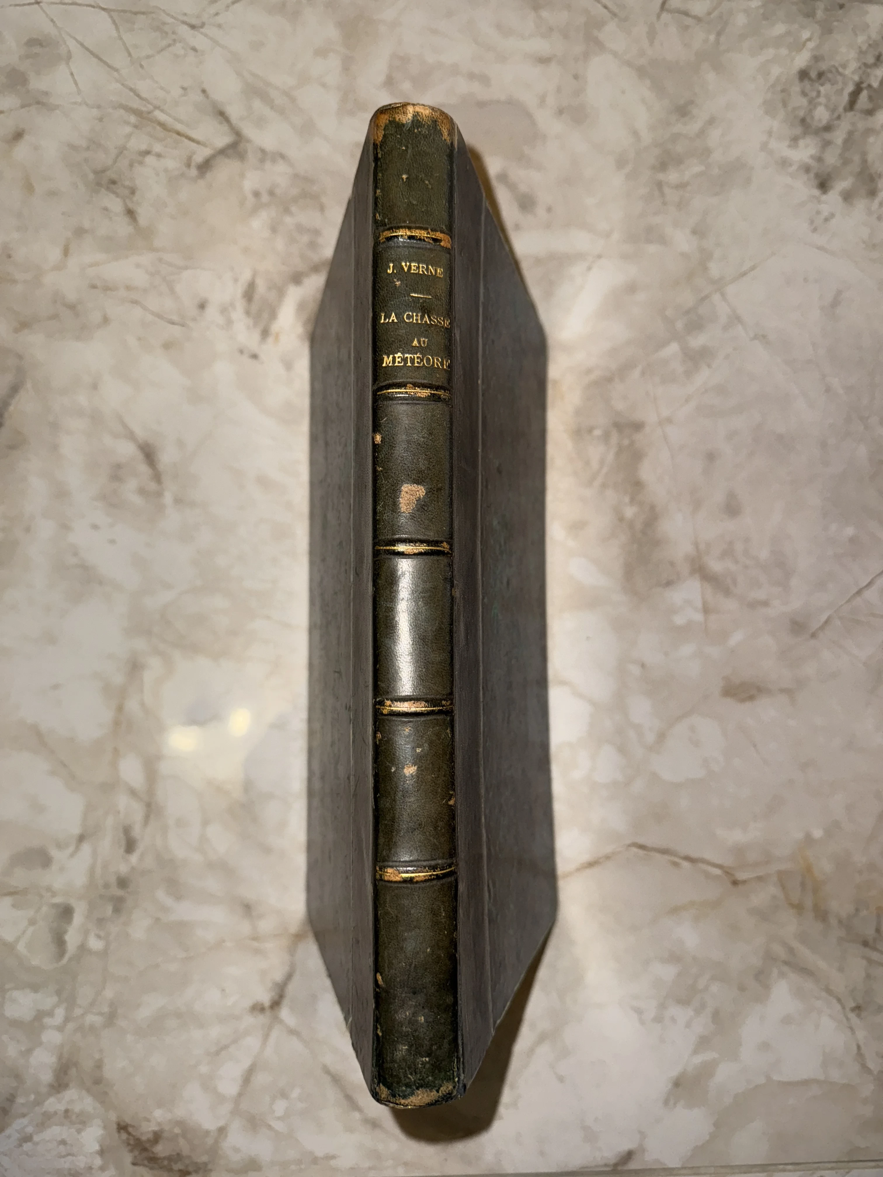 Изысканный старинный переплет с благородной патиной времени хранит в себе одно из поздних произведений великого фантаста — роман «В погоне за метеоритом». Золотое тиснение на кожаном корешке сохранило свою четкость, подчеркивая коллекционную ценность этого французского издания. Этот экземпляр станет жемчужиной личной библиотеки и проводником в эпоху классических приключений.