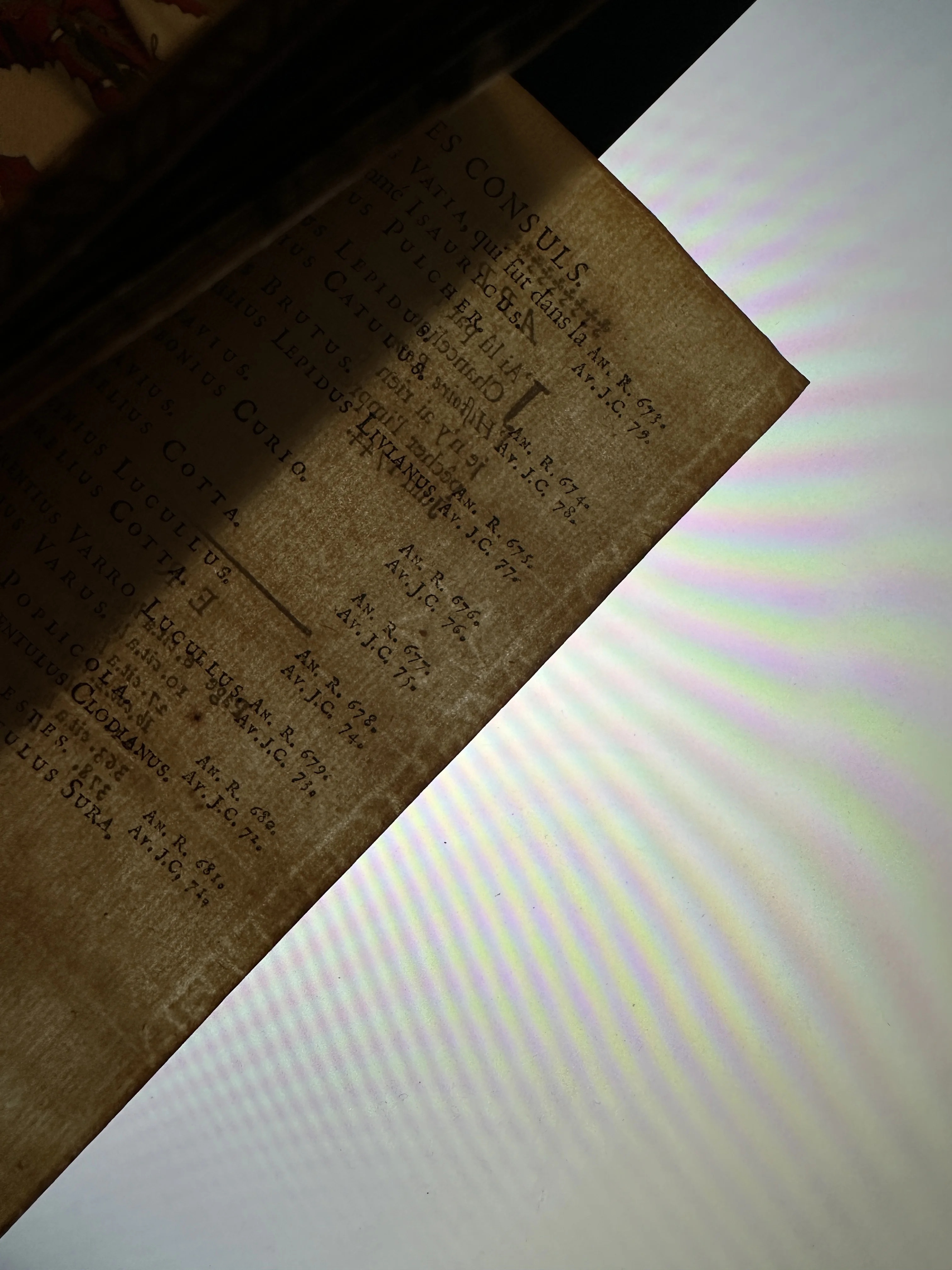 Макросъемка страницы старинной книги на французском языке с перечнем имен римских консулов и историческими датами на пожелтевшей бумаге.