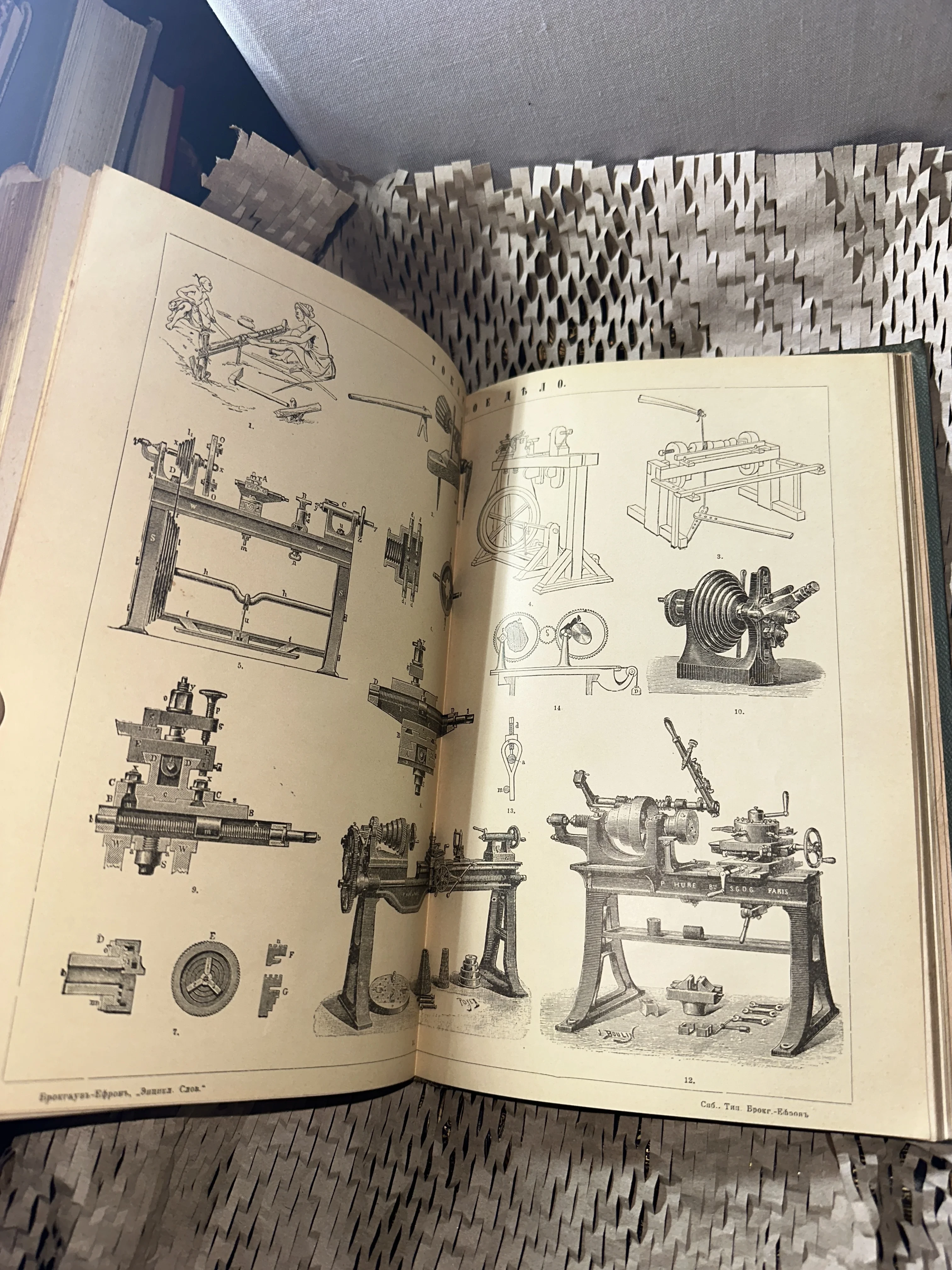 Изысканный образец технической графики из легендарного энциклопедического словаря Брокгауза и Ефрона. На пожелтевших от времени страницах запечатлена эволюция токарного мастерства с филигранной точностью каждой детали и рычага. Состояние бумаги подчеркивает благородный возраст издания, делая его великолепным подарком для коллекционера или инженера.