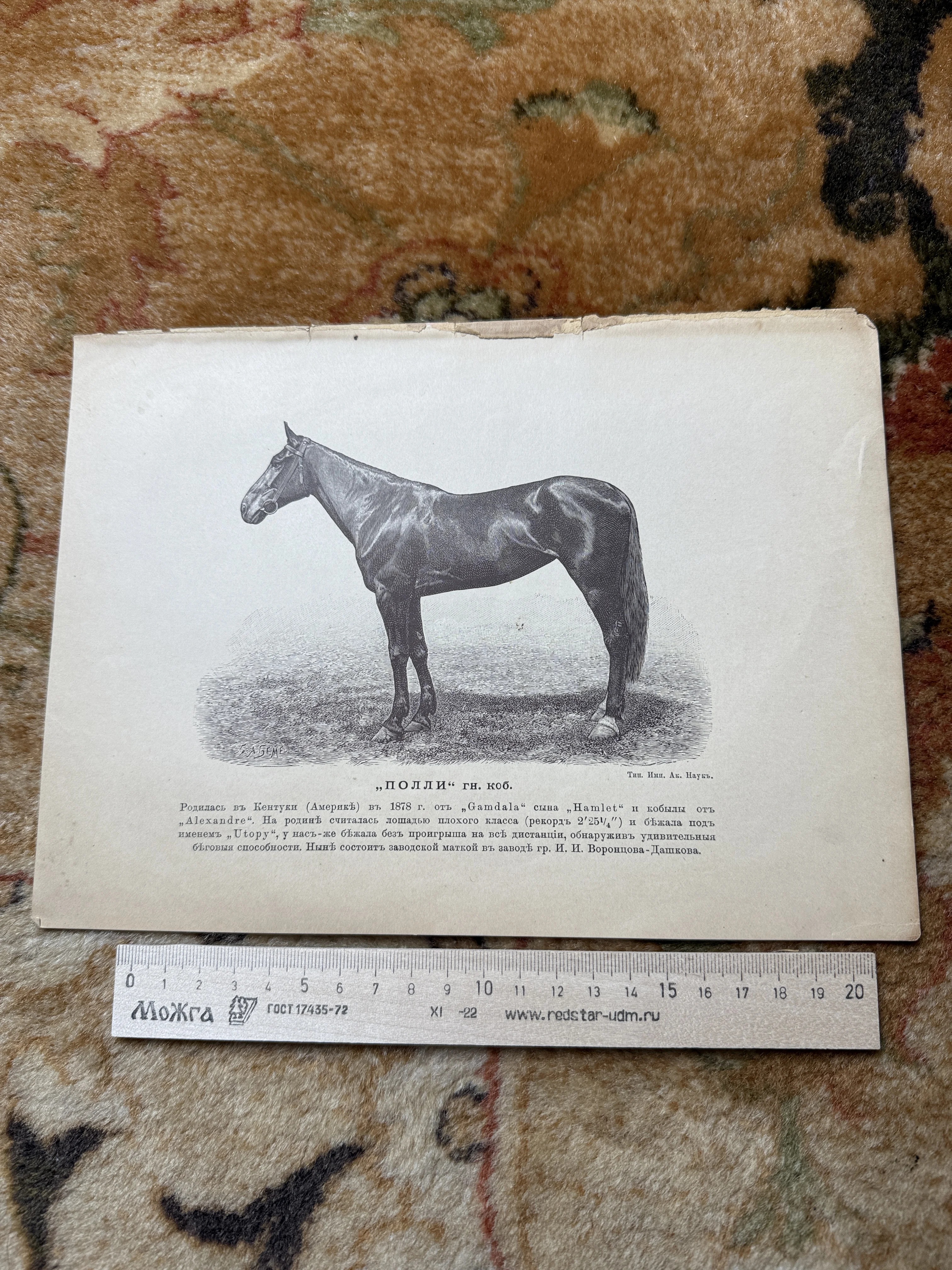 Редкая иппологическая гравюра конца XIX века, выполненная художником А. Бёмом и отпечатанная в Типографии Императорской Академии Наук. На листе запечатлена гнедая кобыла Полли, привезенная из Кентукки и ставшая легендой бегов и племенной маткой в знаменитом заводе графа И. И. Воронцова-Дашкова. Прекрасная сохранность бумаги и историческая справка делают этот предмет ценным экземпляром для тематической коллекции.