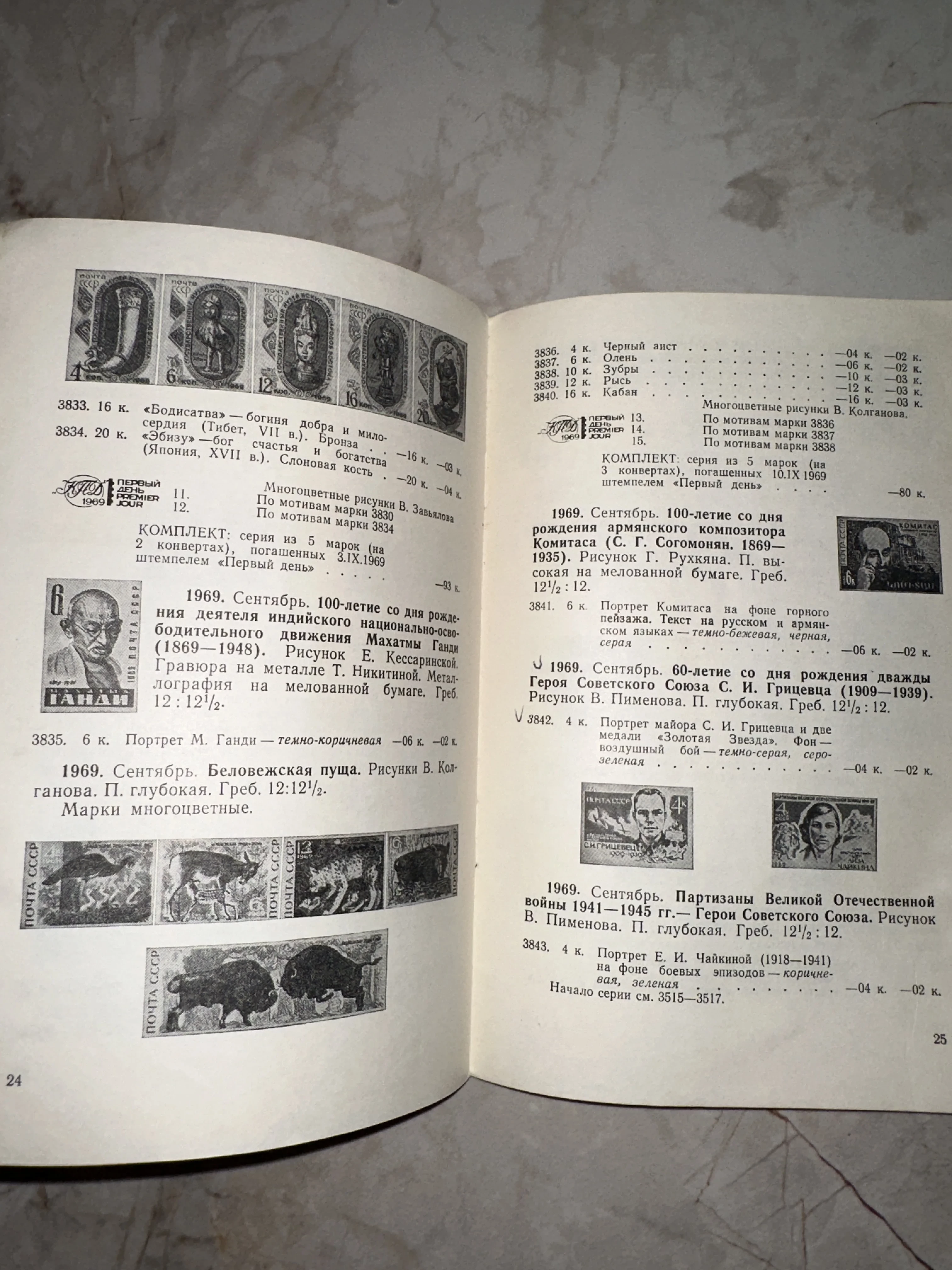 Этот разворот филателистического каталога открывает окно в мир советского коллекционирования конца 60-х годов. На страницах представлены подробные описания и репродукции марок, посвященных Махатме Ганди, фауне Беловежской пущи и выдающимся личностям того времени. Настоящий артефакт для ценителей истории почты, сохранивший дух эпохи и эстетику советской полиграфии.