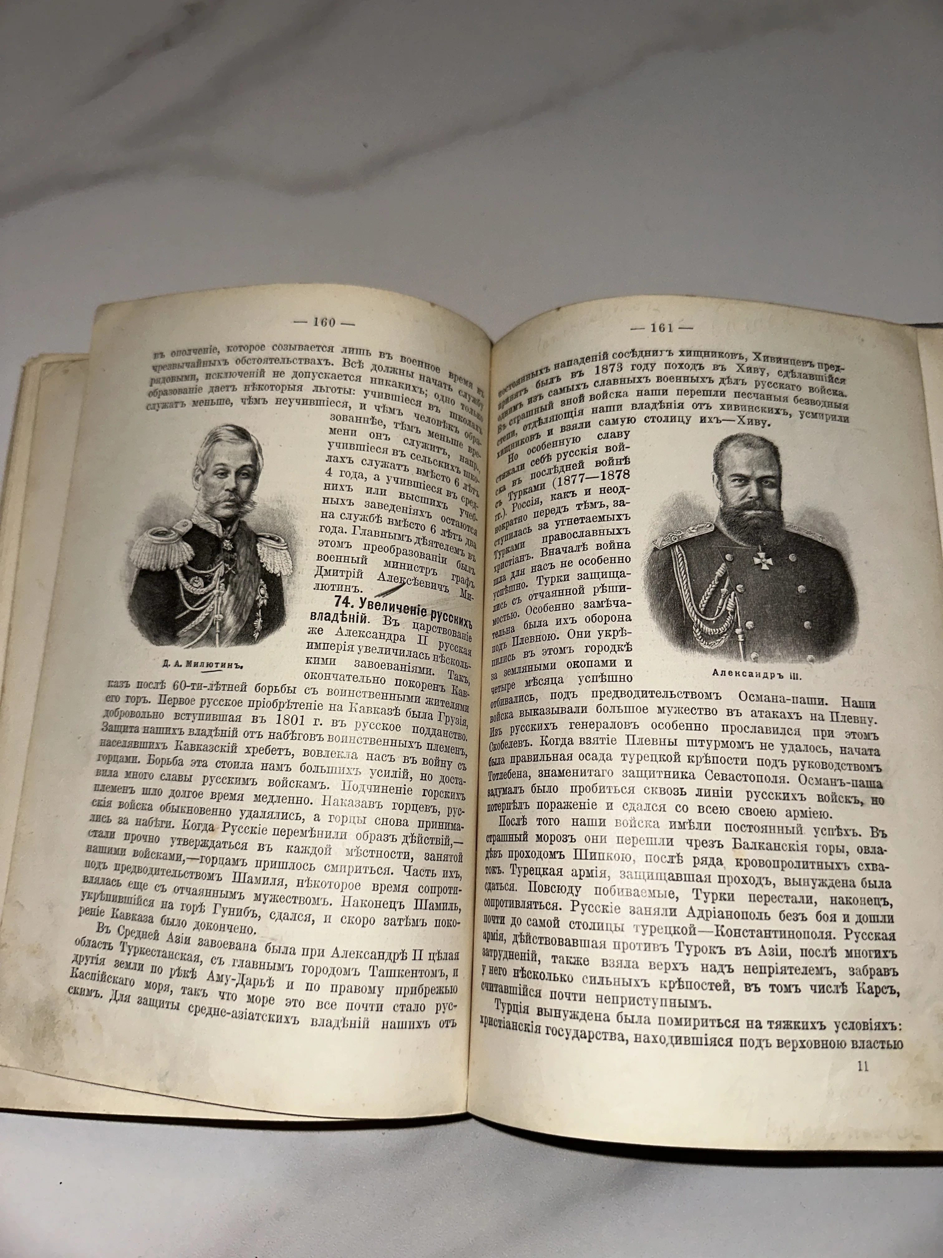 Разворот старинной книги с портретами военного министра Милютина и императора Александра III, текст на дореволюционном русском языке.