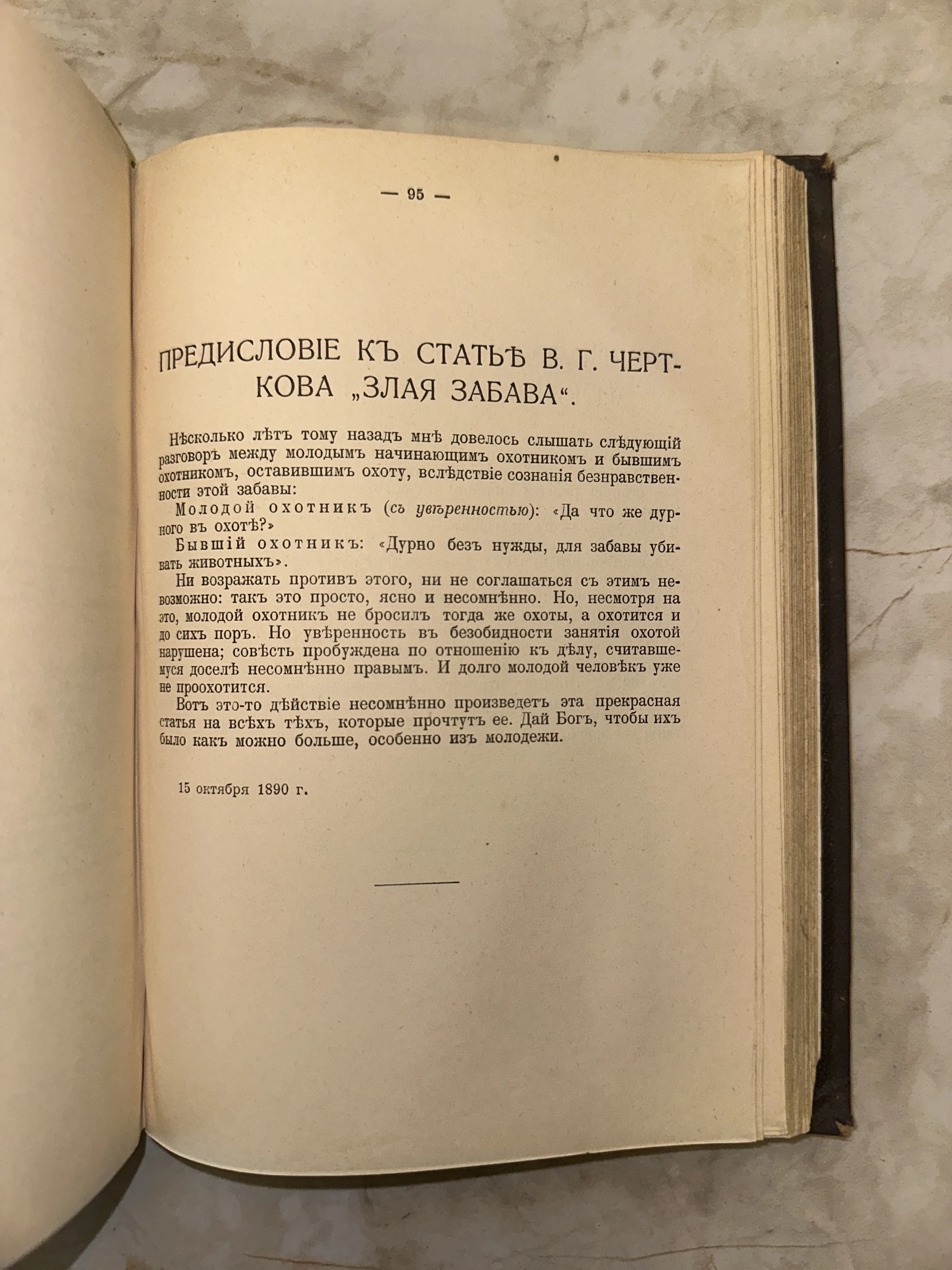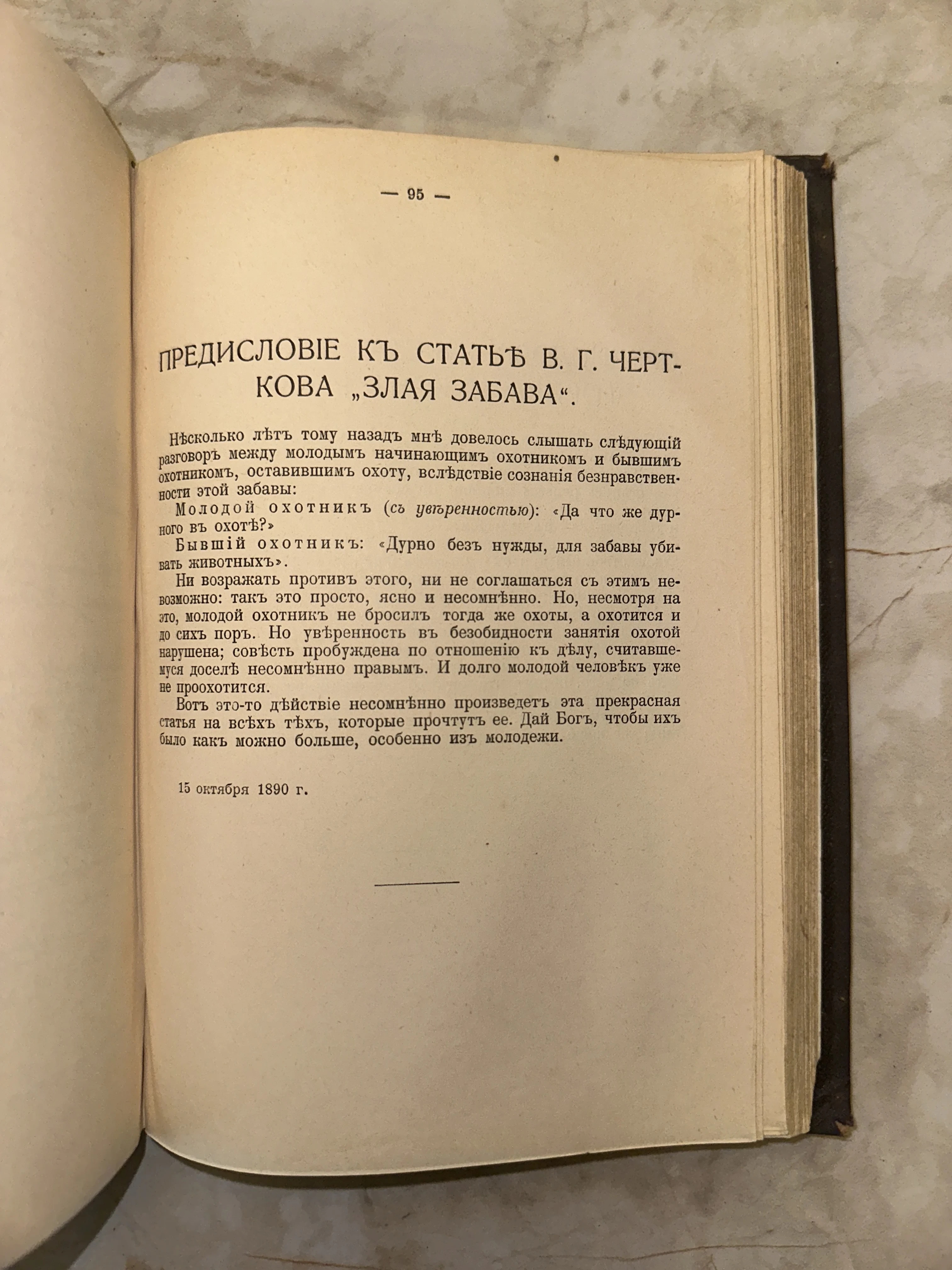 Открытая страница старинной книги с текстом на дореволюционном русском языке, озаглавленным Предисловие к статье В. Г. Черткова Злая забава, датированная 1890 годом.