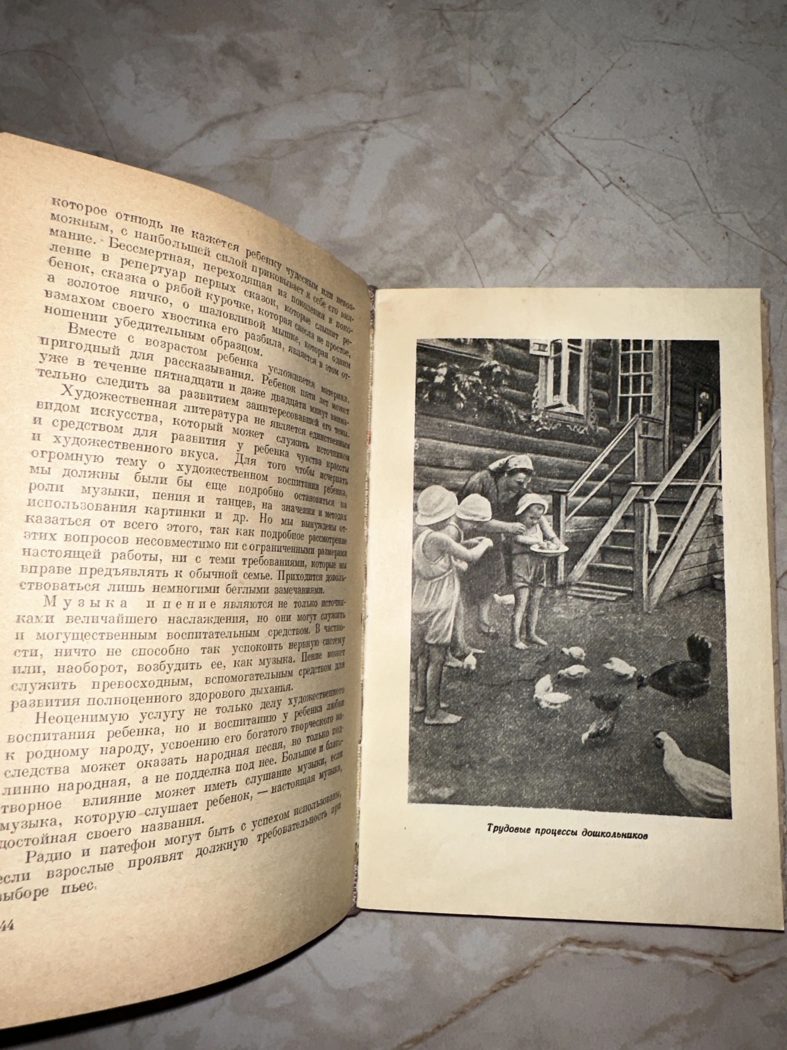 Антикварное издание середины XX века, посвященное гармоничному развитию ребенка через искусство и труд. На странице представлена выразительная иллюстрация «Трудовые процессы дошкольников», запечатлевшая сцену деревенского быта. Пожелтевшая бумага и классическая советская типографика делают этот экземпляр ценным артефактом педагогической истории.