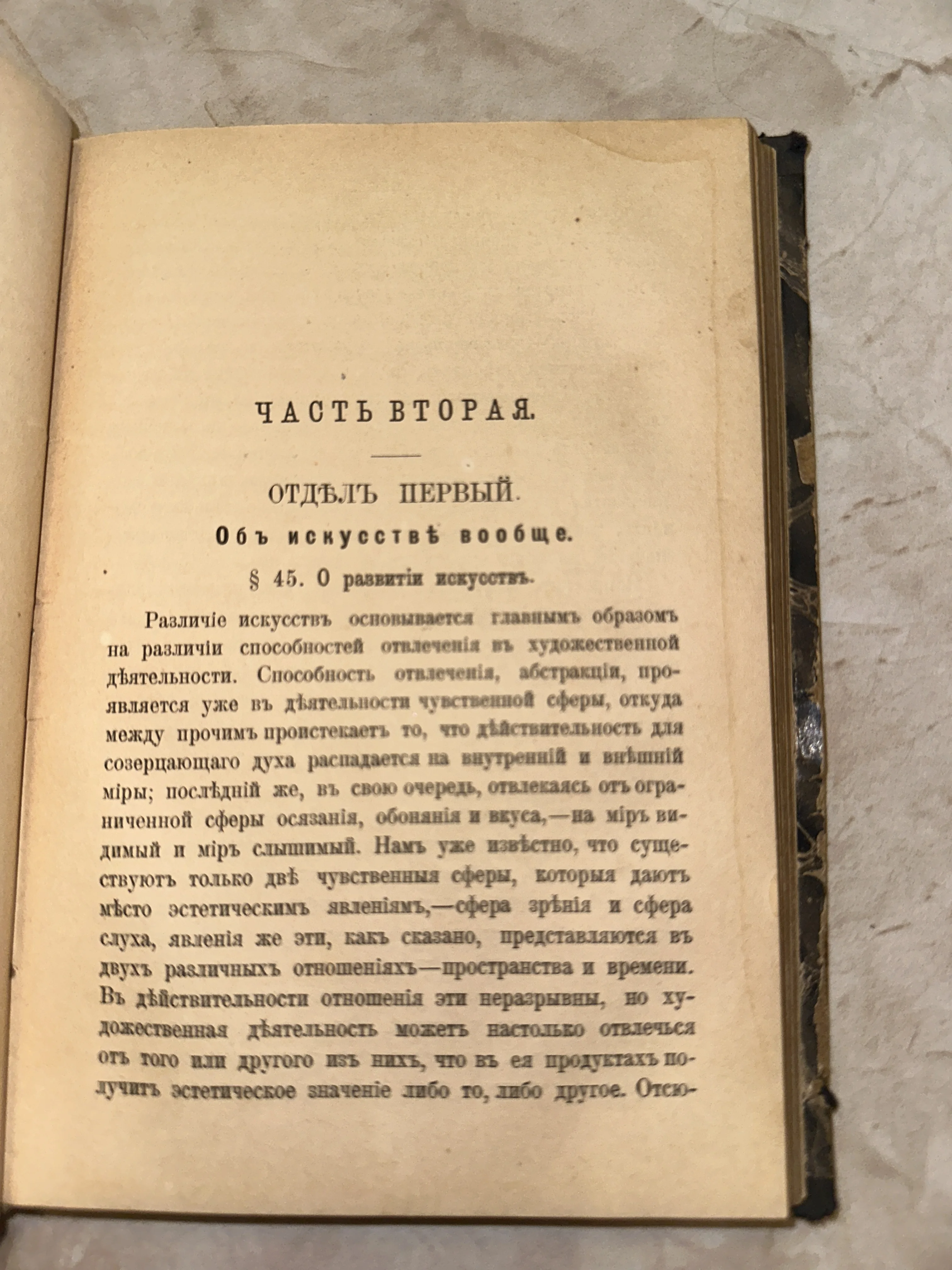 Разворот старинной книги с текстом в дореволюционной орфографии, глава об искусстве и эстетике.