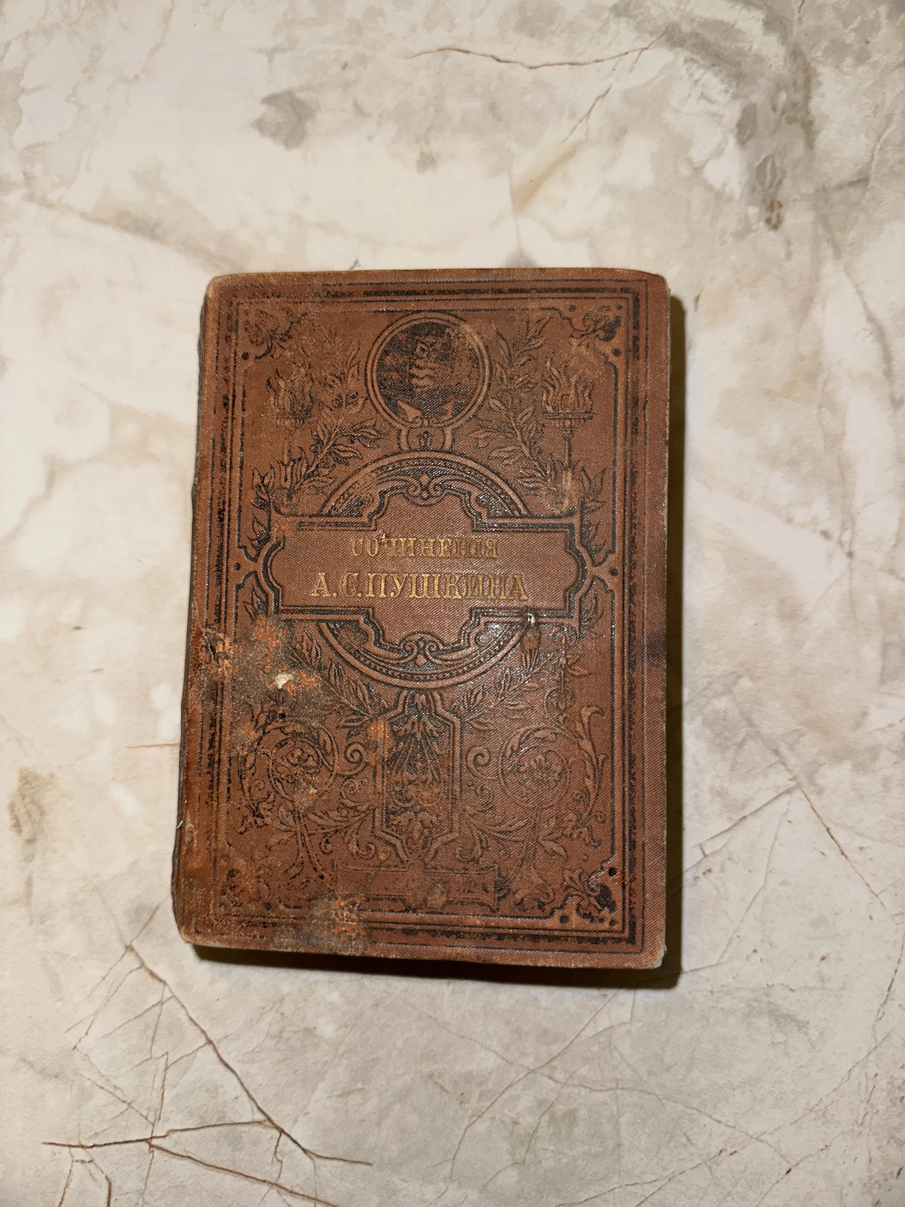 Изящный антикварный том в оригинальном переплете с богатым художественным тиснением, сохранивший дух ушедшей эпохи. Благородная патина и следы времени на обложке подчеркивают подлинность издания, превращая его в ценный артефакт для коллекционера русской классики. Тщательная проработка декоративных элементов и портретный медальон делают эту книгу выдающимся образцом книжного искусства прошлых веков.