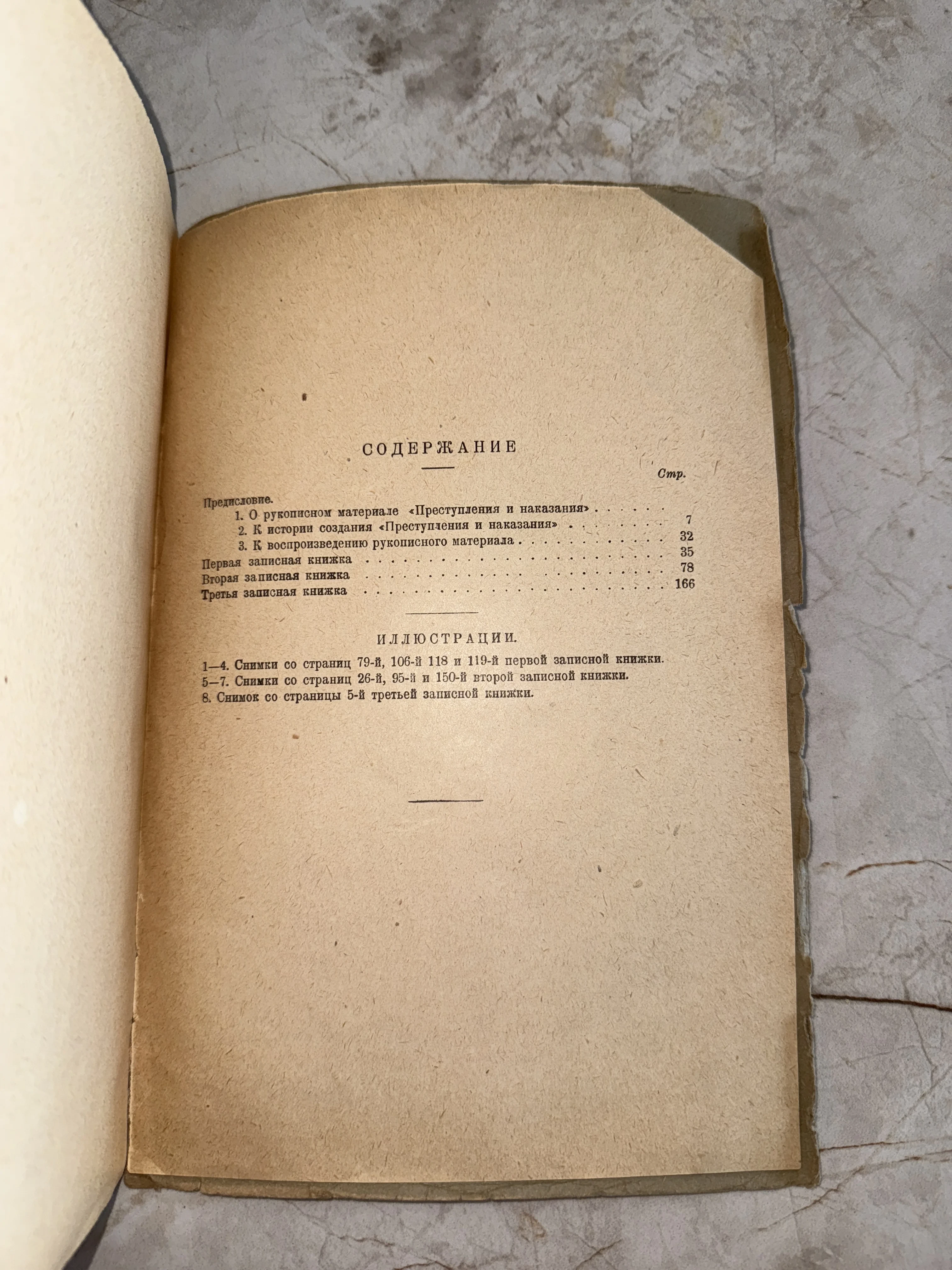 Аутентичная страница содержания из литературоведческого труда, раскрывающего тайны создания великого романа Ф.М. Достоевского. Плотная пожелтевшая бумага и строгая классическая верстка подчеркивают академическую ценность и историческую значимость этого экземпляра. Предмет обладает особой архивной атмосферой и станет ценной находкой для ценителей русской классики.