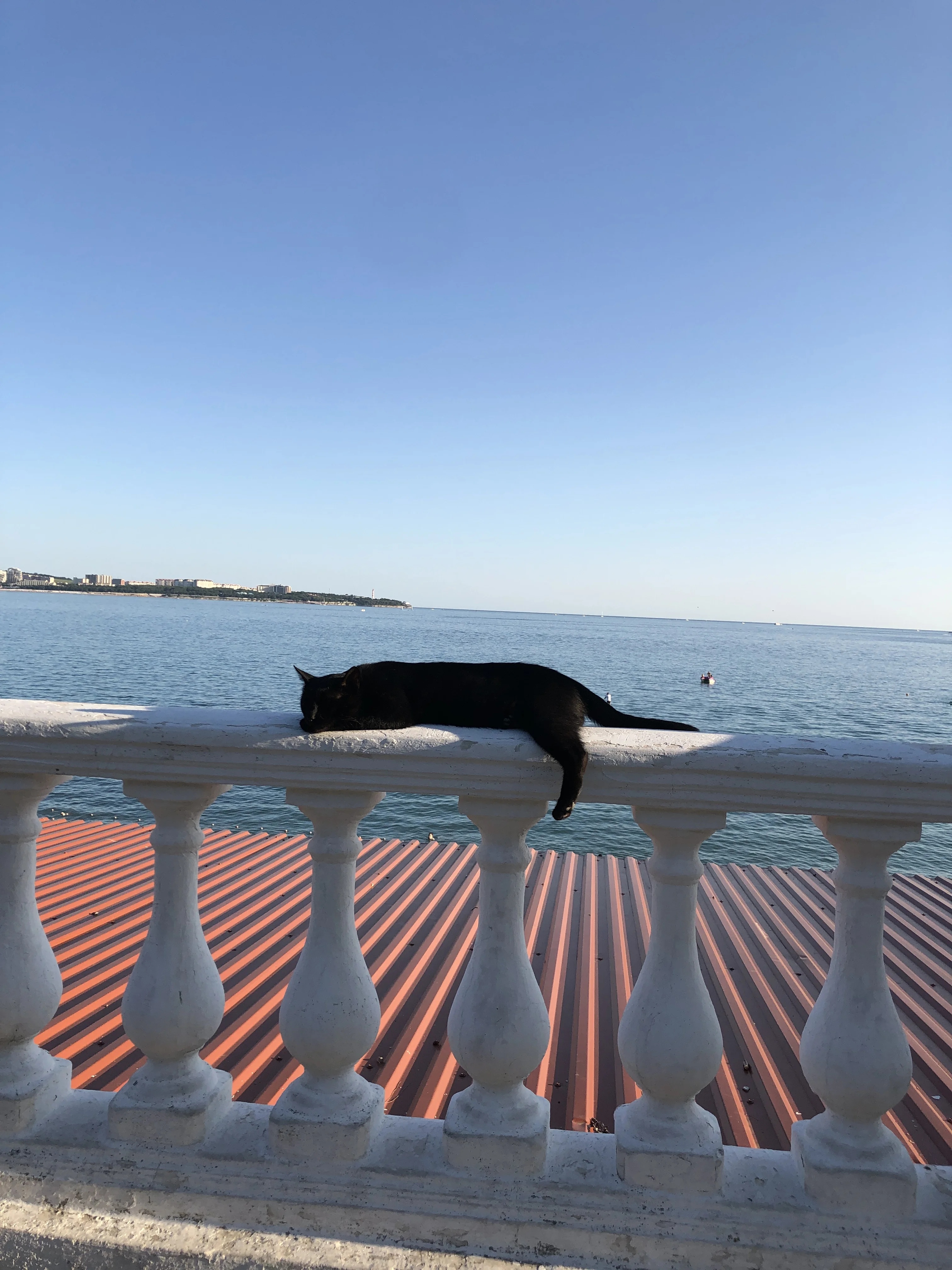 Снимок передает атмосферу абсолютного спокойствия и южного тепла на залитой солнцем набережной. Изящный силуэт черного кота на фоне классической белой балюстрады и бескрайней морской глади создает гармоничный образ безмятежного летнего отдыха. Фотография наполнена светом и воздухом, приглашая зрителя разделить мгновение тишины у самого края моря.