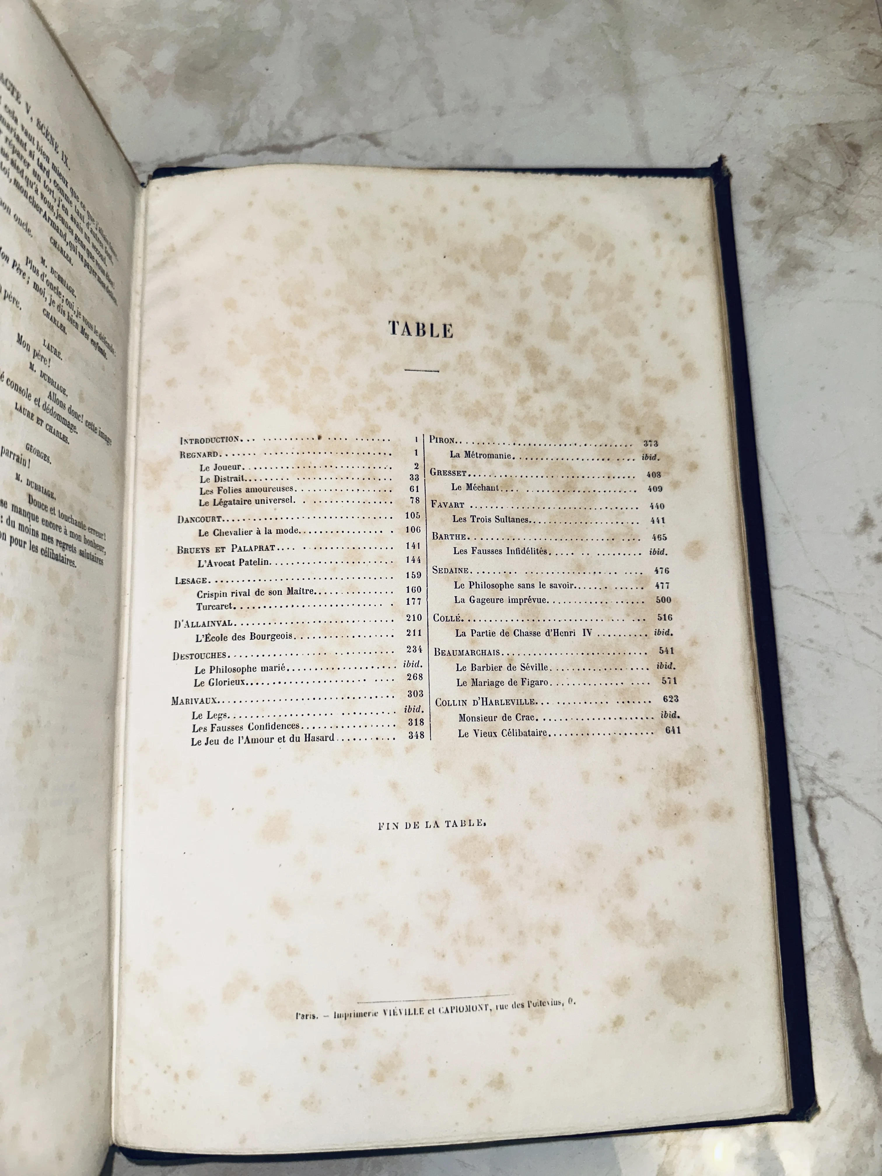 Перед вами аутентичный фрагмент истории французского театра, содержащий список произведений таких мастеров, как Бомарше, Мариво и Реньяр. Благородная патина и характерный фоксинг на бумаге подчеркивают почтенный возраст издания, выпущенного типографией Viéville et Capiomont. Строгая антиква и классическая верстка делают эту страницу настоящим подарком для библиофила и ценителя европейской классики.