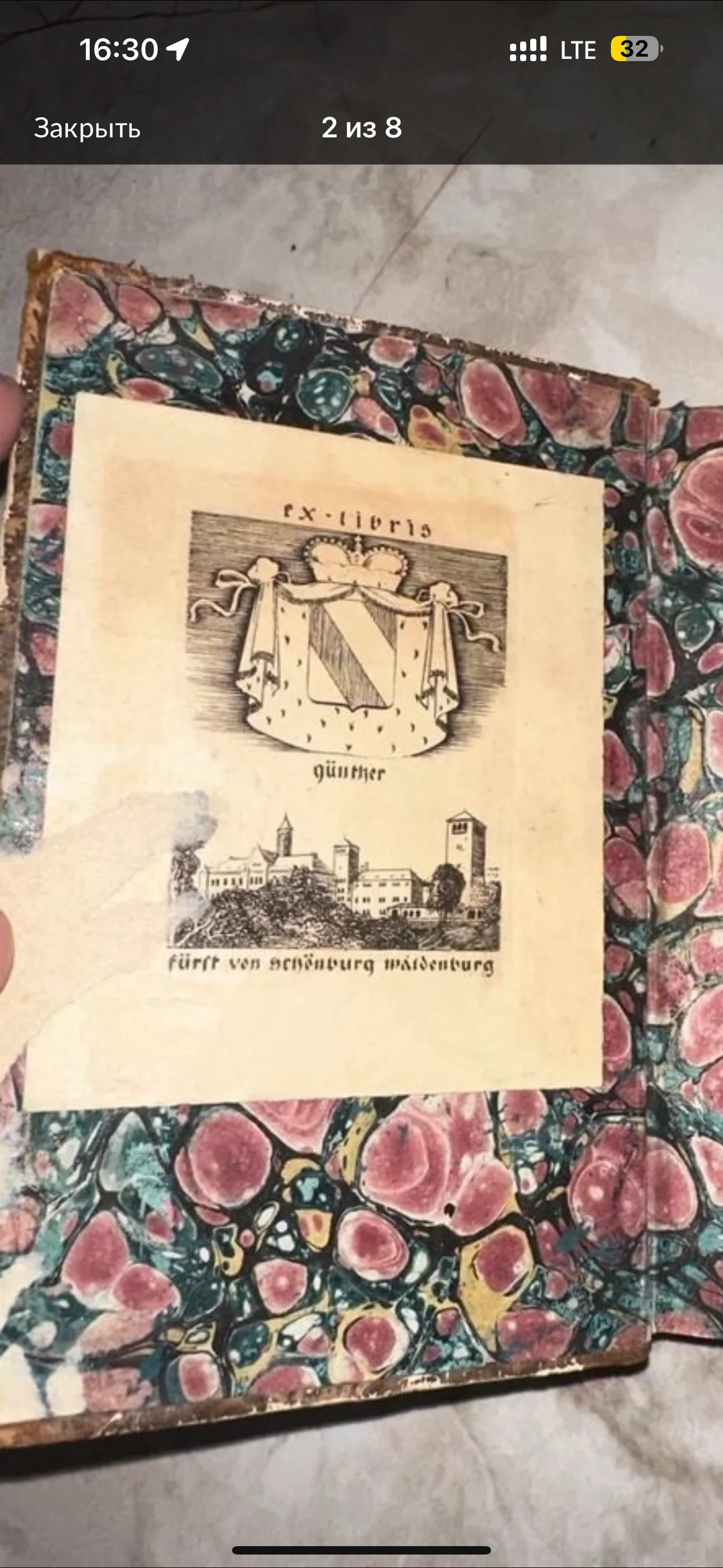Изящный книжный знак на фоне классической мраморной бумаги подчеркивает благородное происхождение издания из личной библиотеки князя Шёнбург-Вальденбургского. На детальной гравюре изображен родовой герб под короной и величественная панорама замка, передающая дух европейской аристократии. Прекрасная сохранность этого элемента делает экземпляр ценным артефактом для коллекционеров геральдики и редких фолиантов.