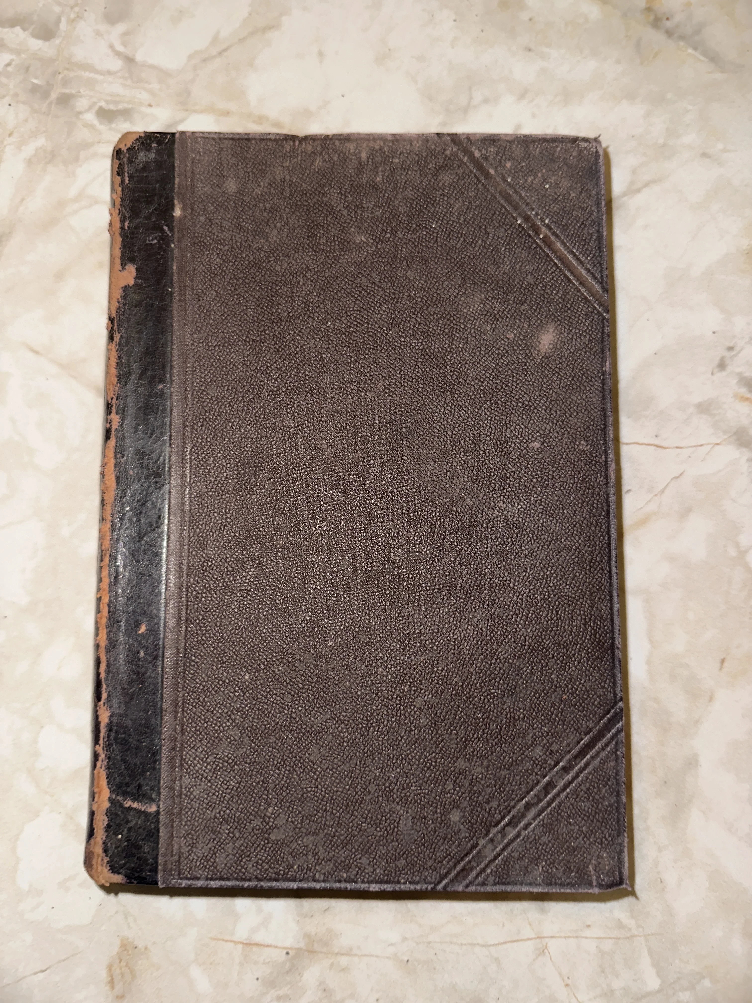 Старинная книга в темной обложке с зернистой текстурой и потертым корешком на светлом фоне.