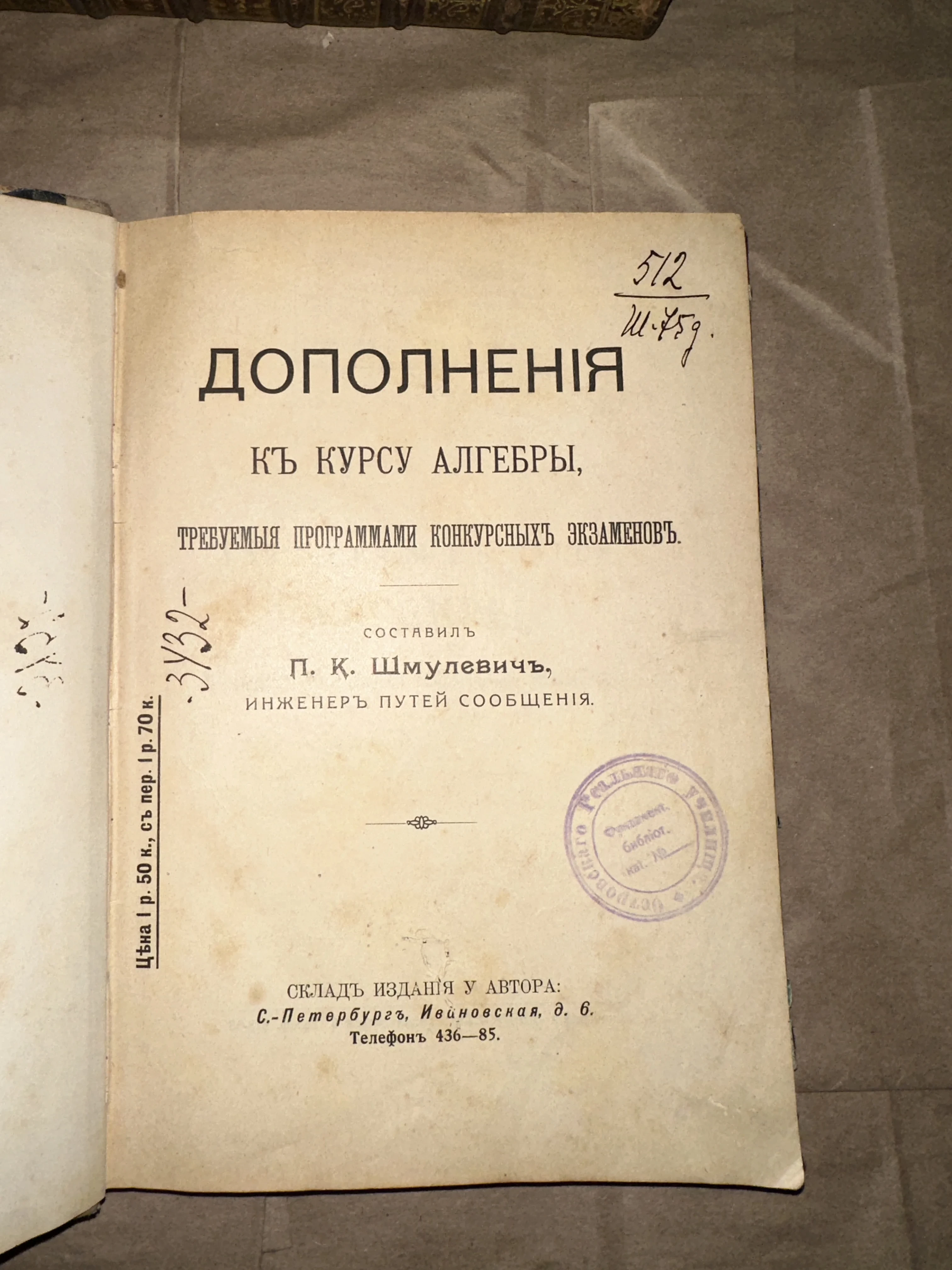 Уникальное дореволюционное учебное пособие, составленное инженером путей сообщения П. К. Шмулевичем для подготовки к конкурсным экзаменам. Страница хранит подлинную атмосферу эпохи: оригинальный штамп фундаментальной библиотеки реального училища и старинные рукописные шифры на пожелтевшей бумаге делают этот экземпляр ценным свидетельством истории образования.
