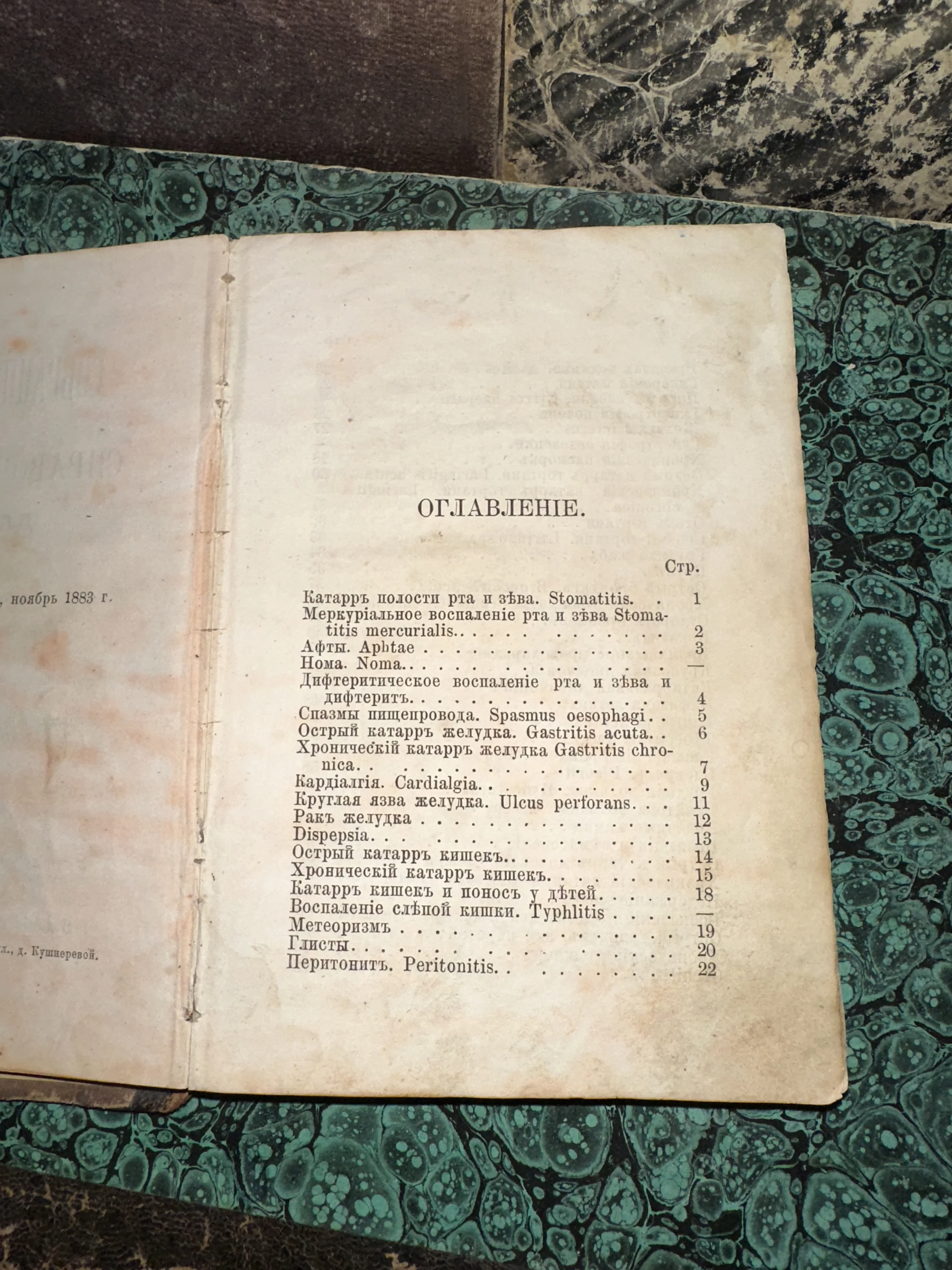 Уникальный документ эпохи — страница оглавления медицинского издания, датированного ноябрем 1883 года. Фактурная пожелтевшая бумага с ятями и латинской терминологией лежит на фоне изысканного мраморного форзаца, передавая атмосферу врачебного кабинета позапрошлого века. Книга сохранила четкость печати и станет ценным приобретением для коллекционеров антикварной литературы.