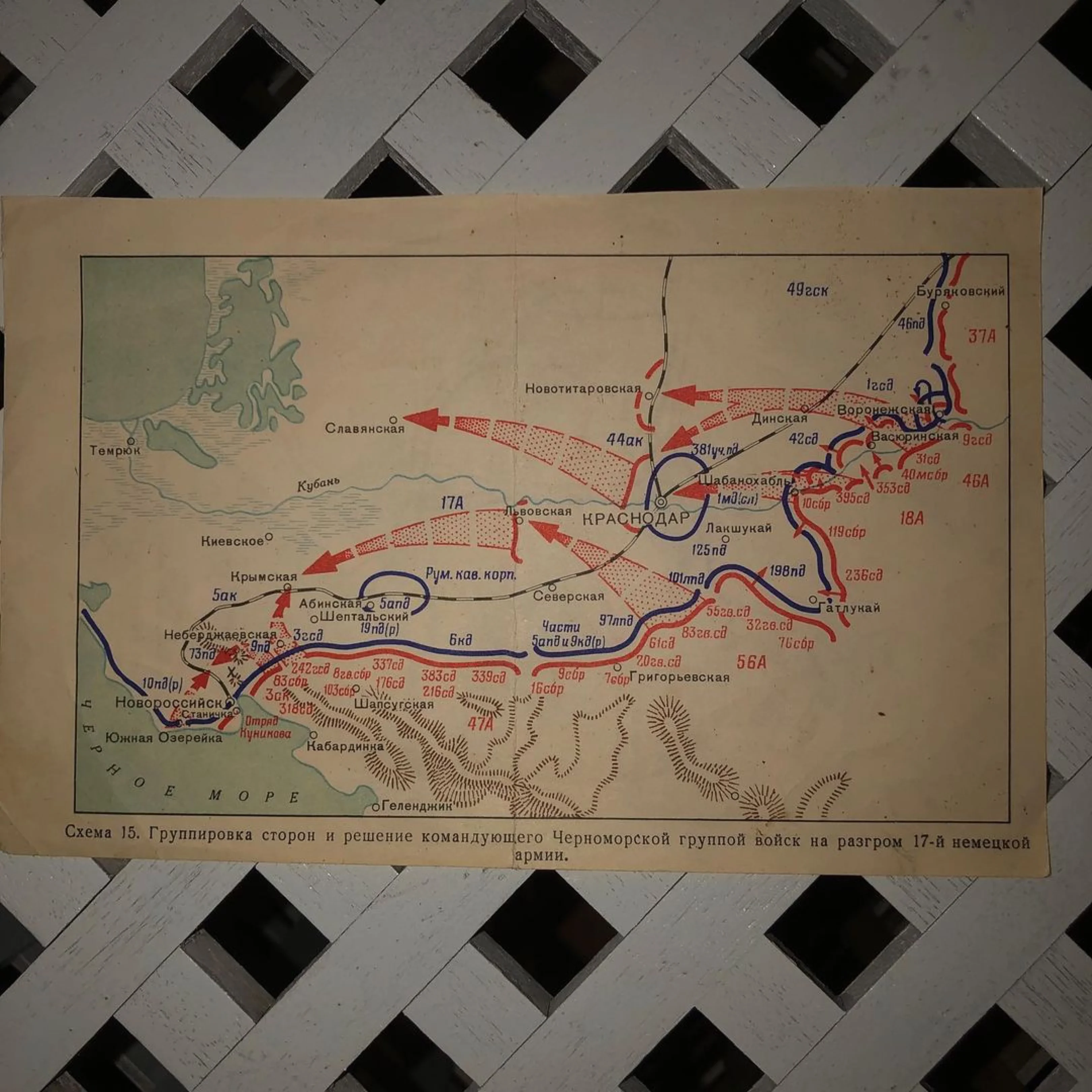 Уникальный документ эпохи, детально иллюстрирующий стратегический замысел командования Черноморской группы войск в годы Великой Отечественной войны. На пожелтевшей бумаге отчетливо видны тактические стрелы наступления и линии обороны, отражающие динамику сражений за Кубань. Этот подлинный артефакт представляет исключительный интерес для коллекционеров военной истории и исследователей тактики ВОВ.