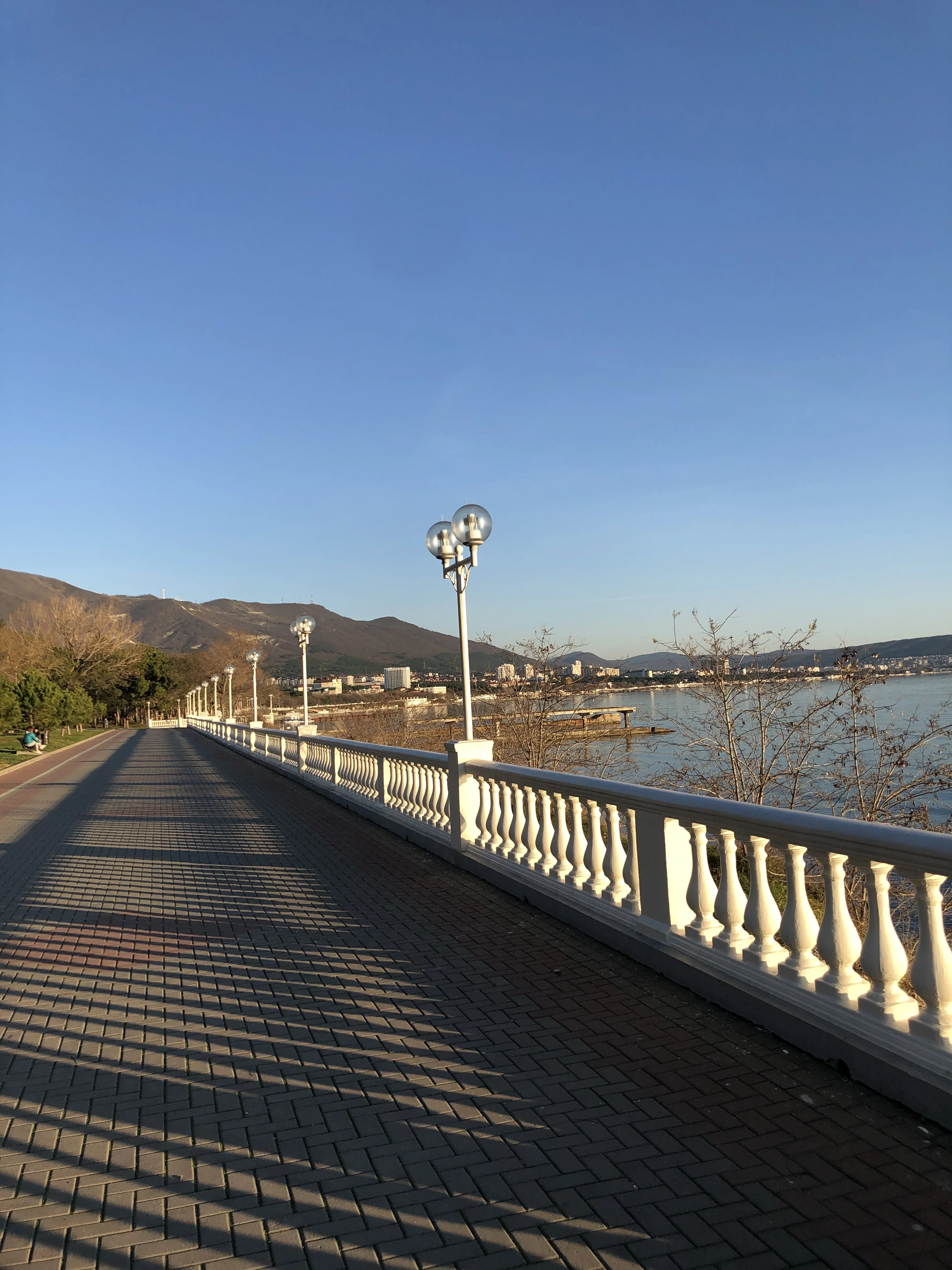 Пешеходная набережная с белой балюстрадой, уличными фонарями и видом на морской залив и горы под чистым небом.