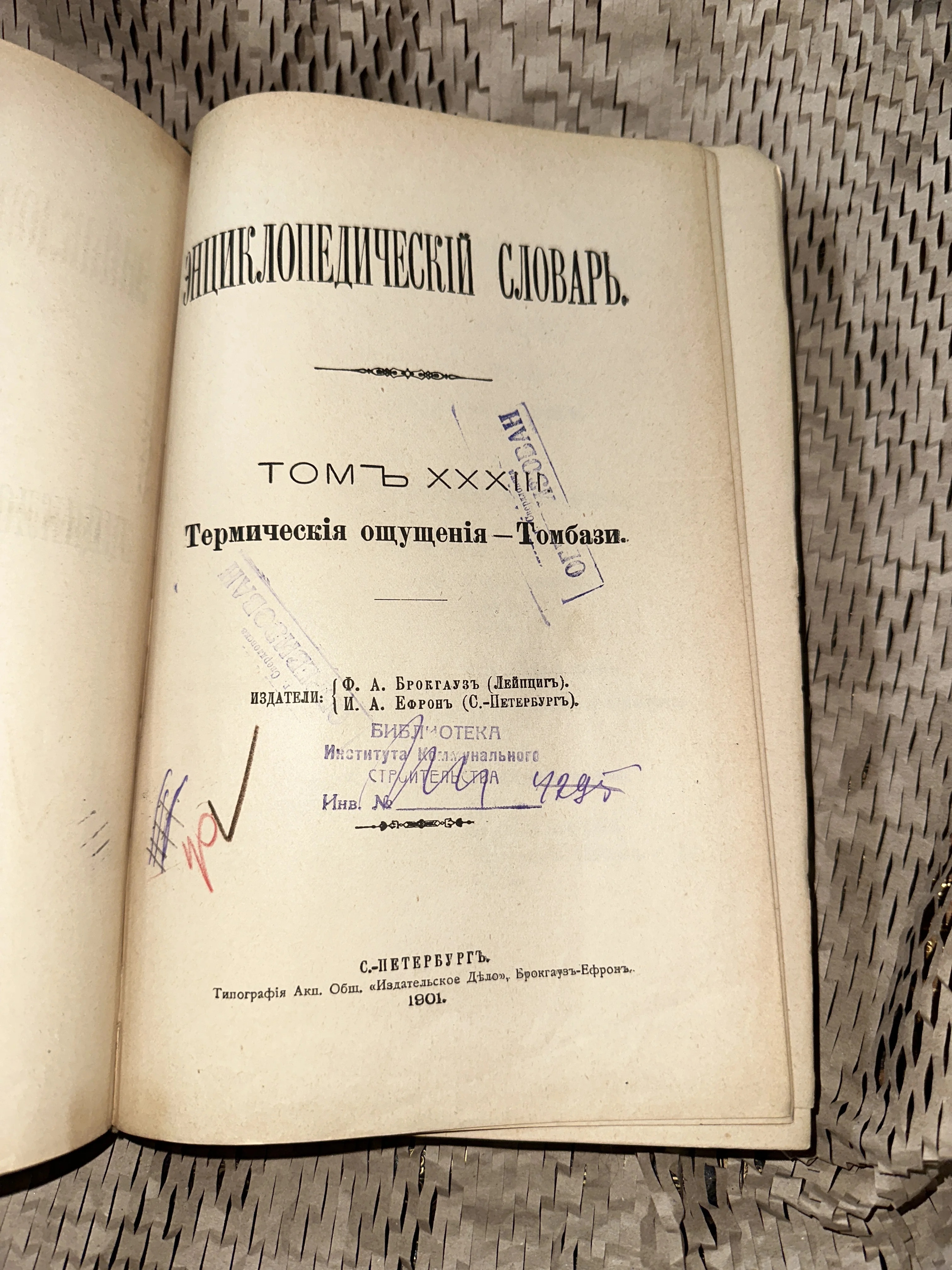Перед вами подлинный артефакт золотой эпохи русского книгоиздания — титульный лист легендарной энциклопедии Брокгауза и Ефрона. Многочисленные библиотечные штампы и рукописные инвентарные номера создают уникальную атмосферу преемственности поколений и подчеркивают богатый провенанс этого экземпляра. Бумага сохранила приятную патину времени, а классическая дореволюционная типографика делает это издание желанным объектом для серьезного коллекционера.