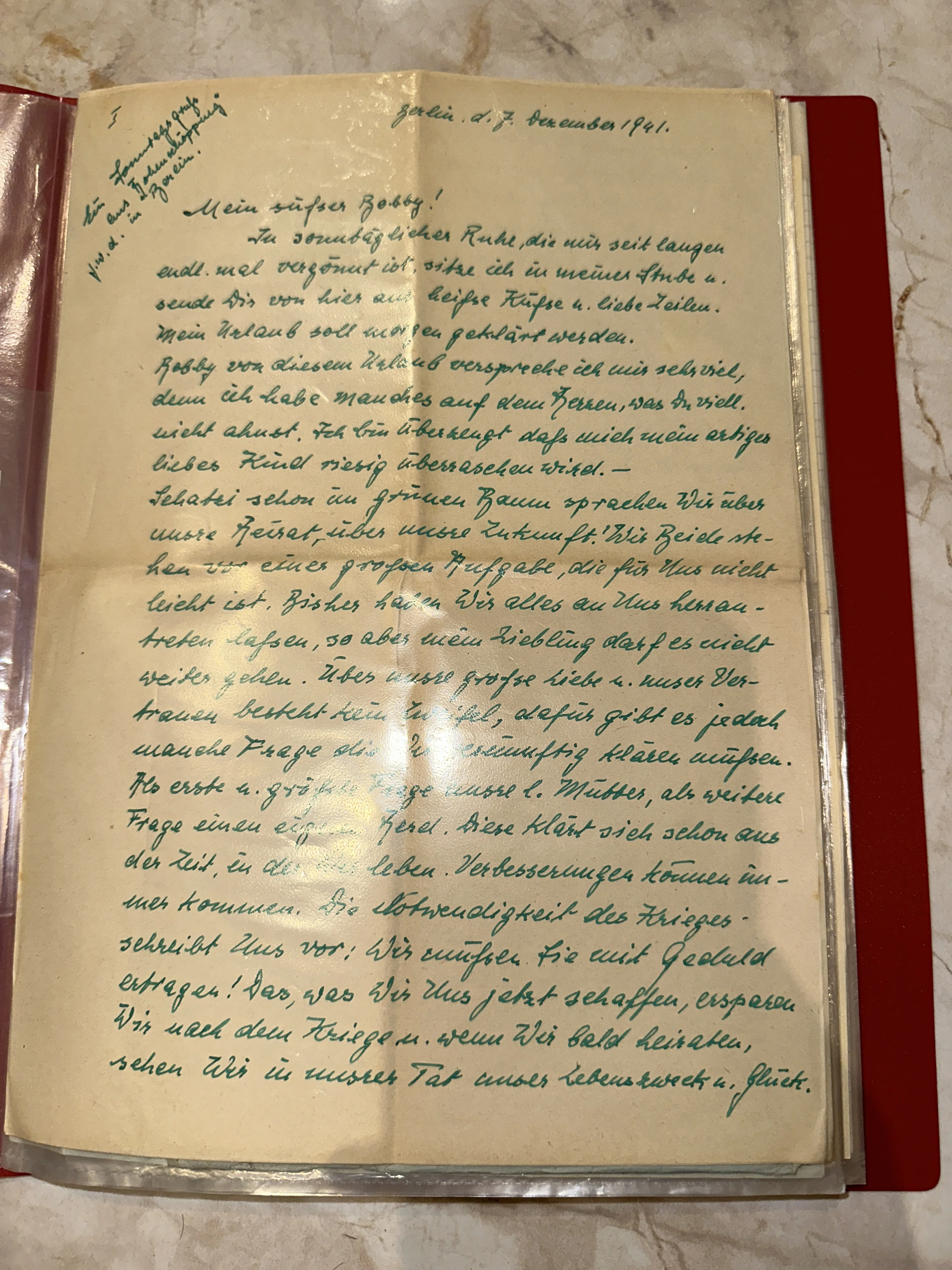 Уникальный документ эпохи — интимное послание из военного Берлина, в котором переплетаются глубокие чувства, надежды на свадьбу и суровая реальность 1941 года. Текст выполнен изящным каллиграфическим почерком на оригинальном листе, сохранившем естественные следы времени и подлинную атмосферу частной переписки прошлого века.