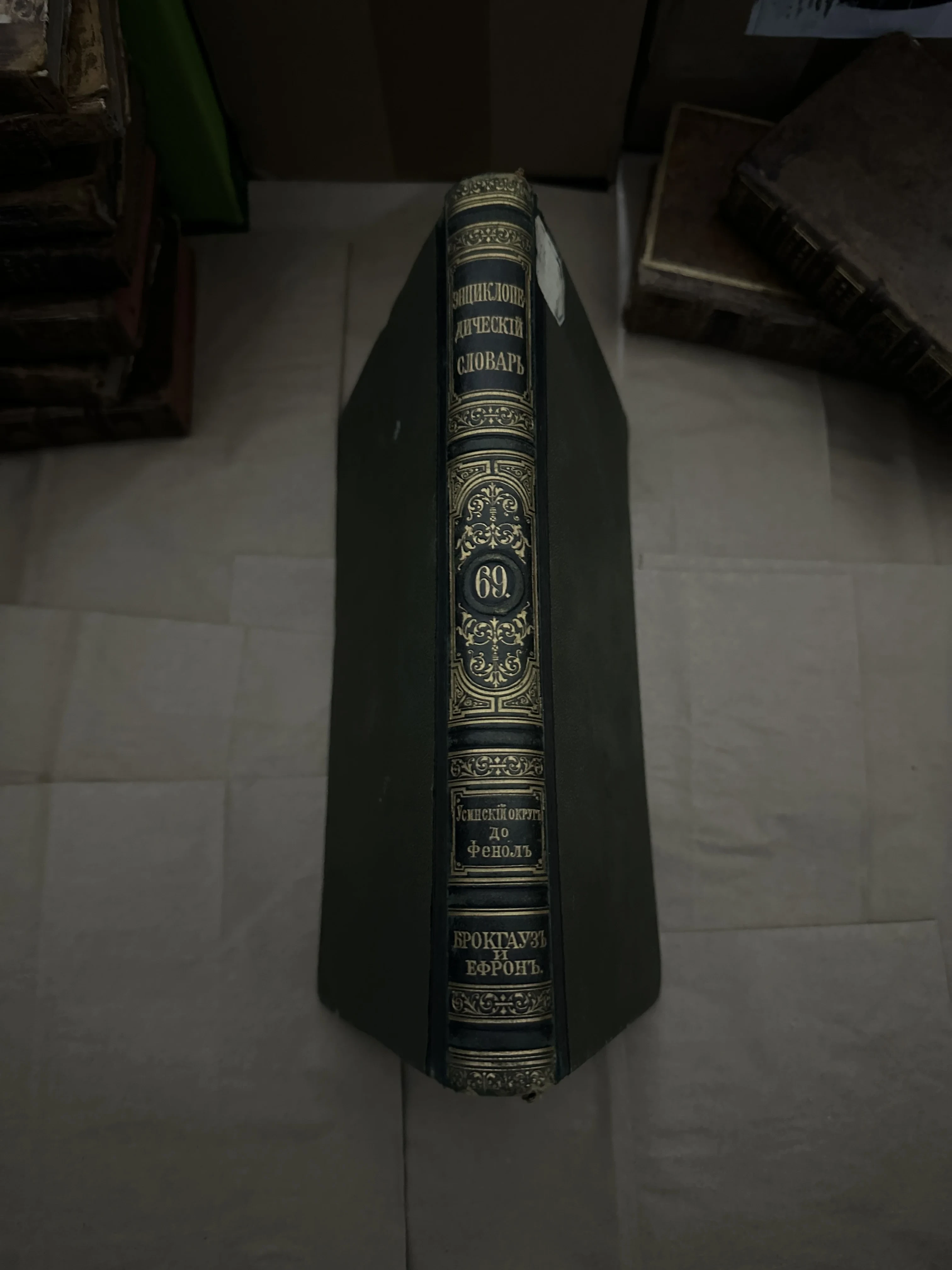 Роскошный образец легендарной дореволюционной энциклопедии с великолепно сохранившимся золотым тиснением на массивном корешке. 69-й том охватывает статьи от Усинского округа до Фенола, представляя собой бесценный источник знаний и подлинное украшение классической библиотеки. Состояние переплета подчеркивает благородный возраст издания и его историческую значимость.