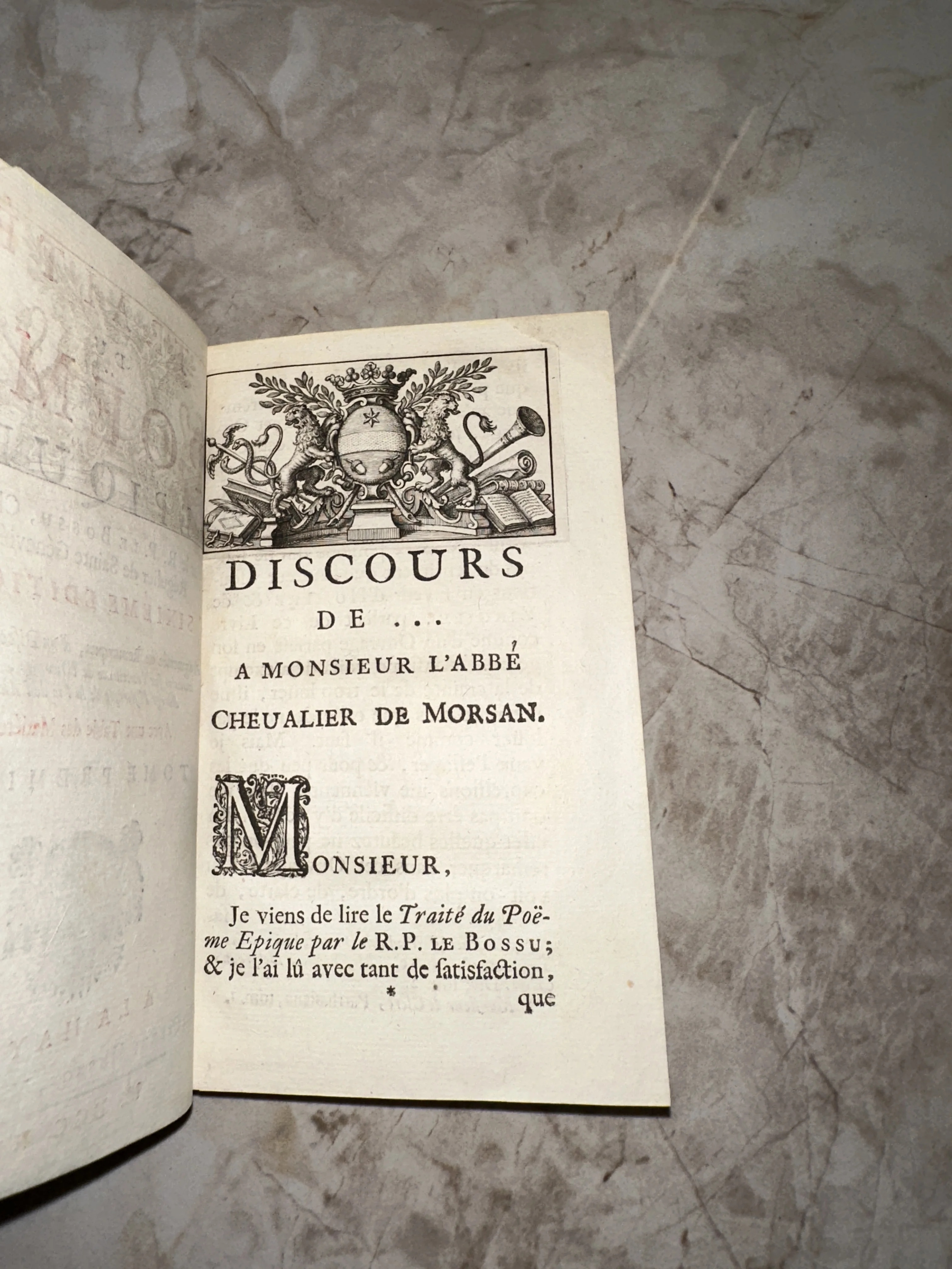 Изысканный образец книгопечатания XVIII века, украшенный детальной гравюрой с геральдической композицией и изящной буквицей. Текст на плотной бумаге верже сохранил идеальную четкость, передавая атмосферу интеллектуальных салонов эпохи Просвещения. Это подлинный артефакт, который станет ценным пополнением коллекции редких европейских изданий.