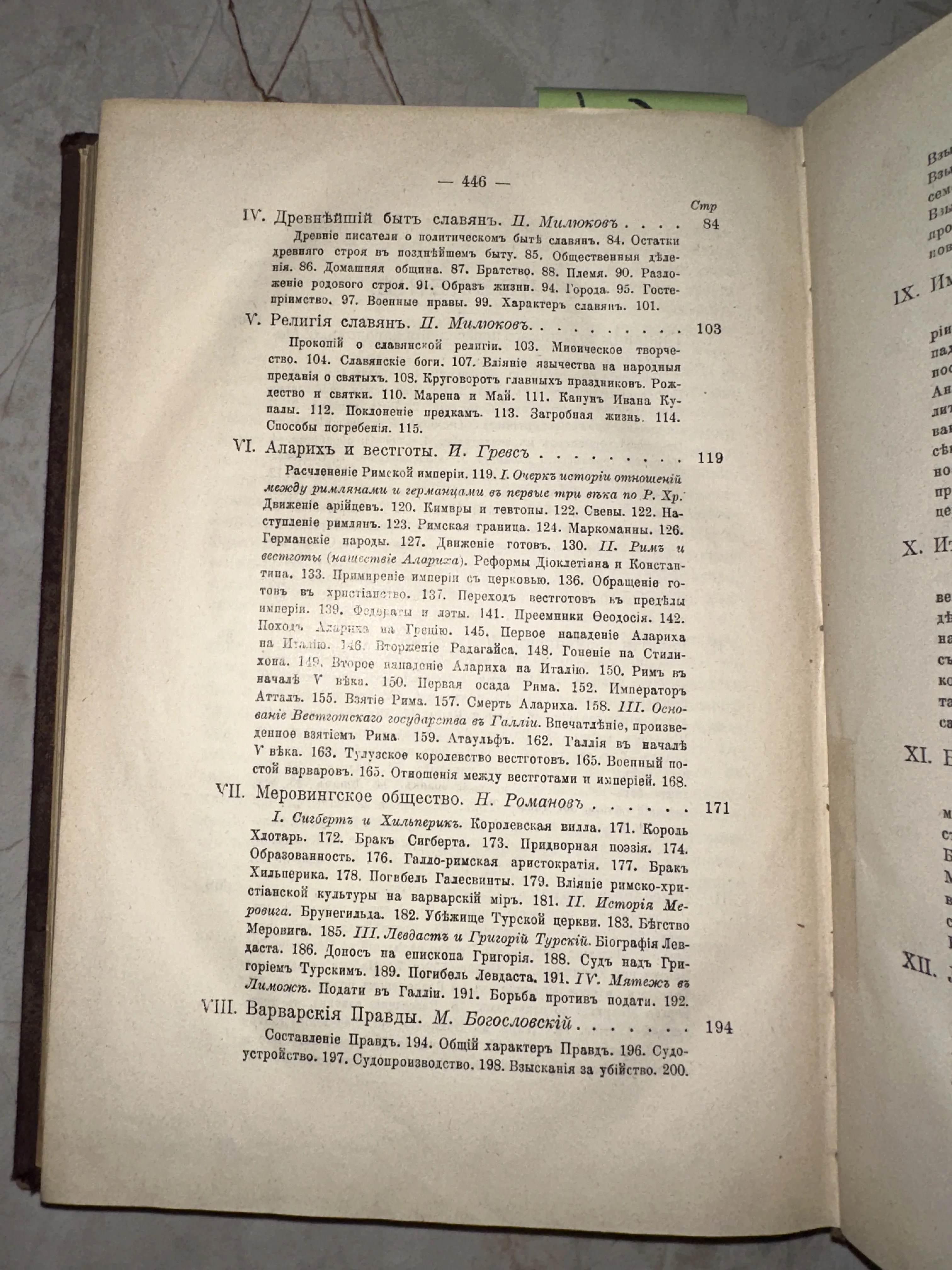Перед вами подлинный фрагмент фундаментального исторического исследования начала XX века, сохранивший дух классической академической школы. Пожелтевшая от времени бумага и характерная дореформенная типографика придают изданию особую коллекционную эстетику. Содержание охватывает важнейшие темы: от древнеславянского быта до истории раннего средневековья и германских племен.