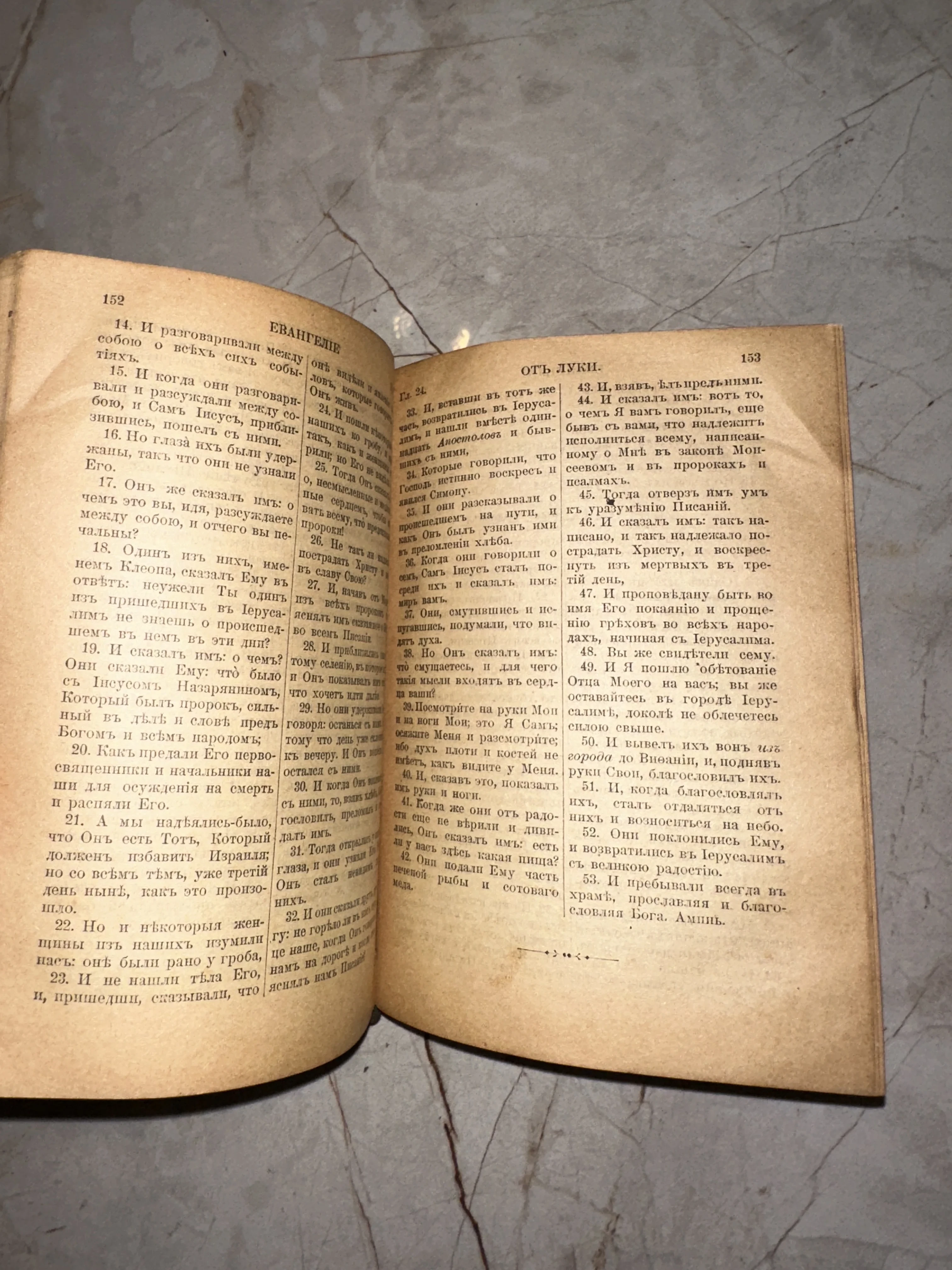 Разворот старинной книги с текстом Евангелия от Луки, напечатанным по дореволюционной орфографии на пожелтевшей бумаге.