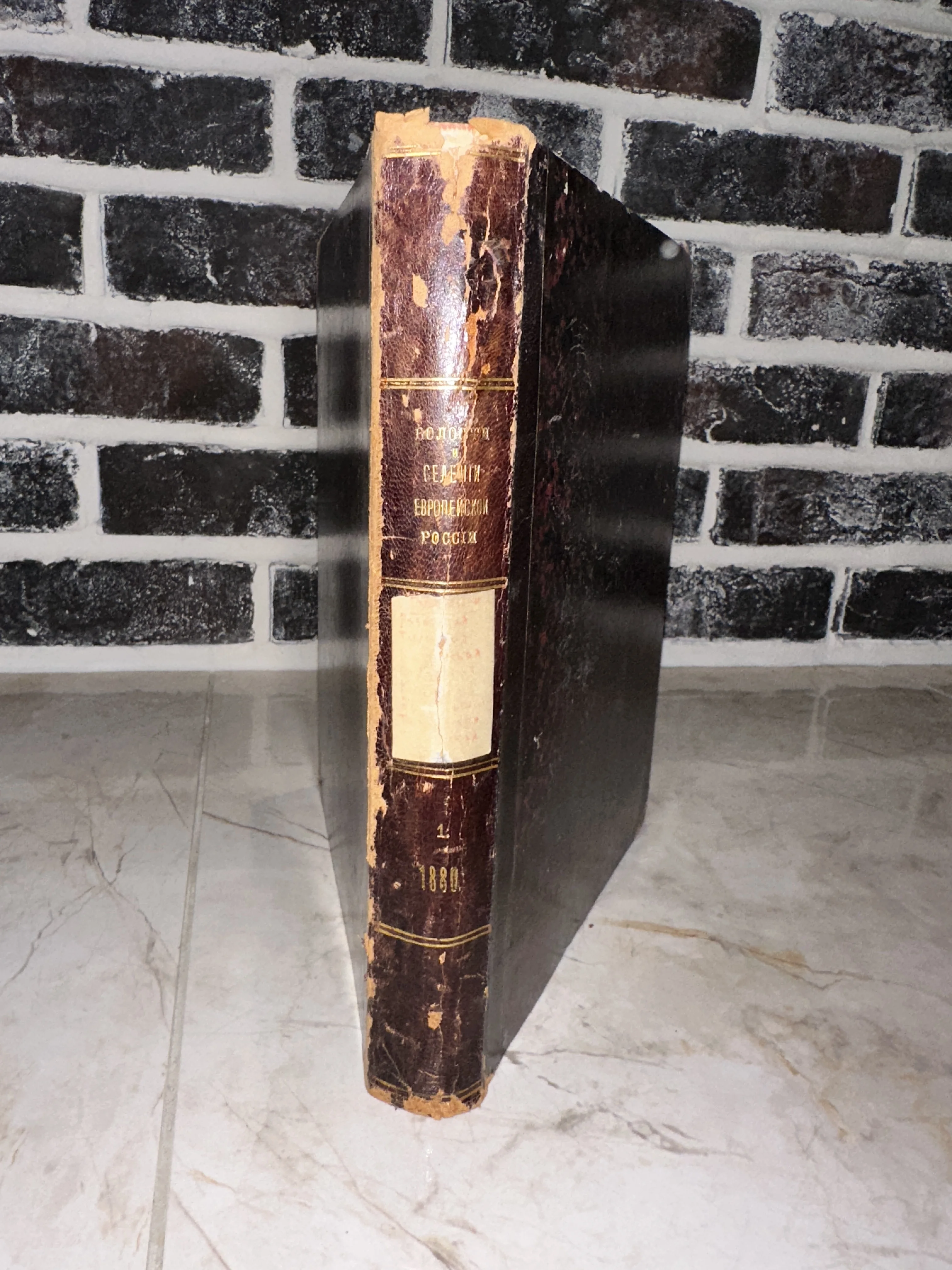 Старинная антикварная книга в темном кожаном переплете с золотым тиснением на корешке, изданная в 1880 году.