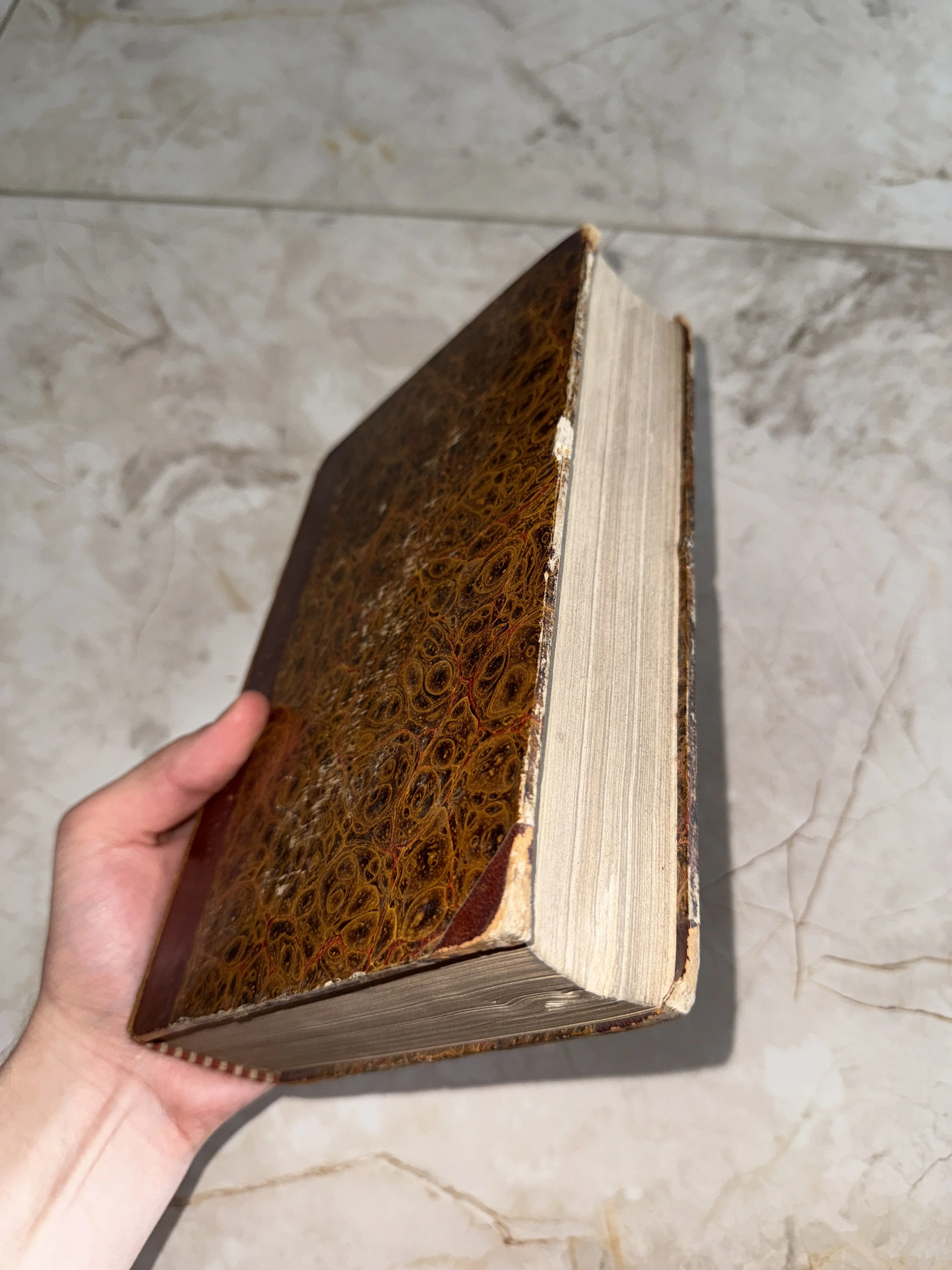 Массивный антикварный том, облаченный в классический переплет с эффектным мраморным рисунком. Естественные следы бытования и пожелтевший от времени книжный блок придают изданию особый шарм, делая его ценным приобретением для любой частной библиотеки.