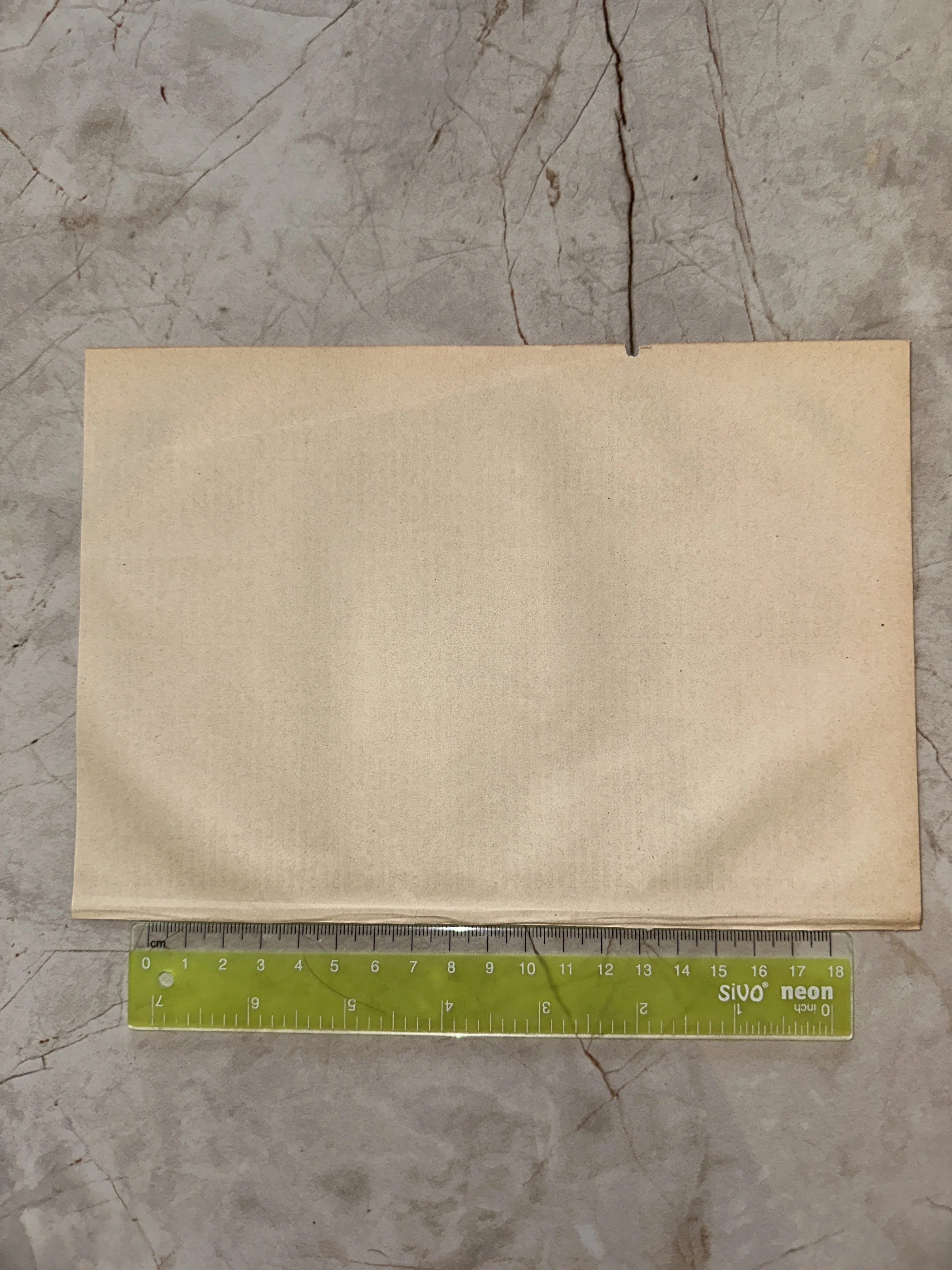 Пожелтевший антикварный лист бумаги на мраморной поверхности рядом с измерительной линейкой.