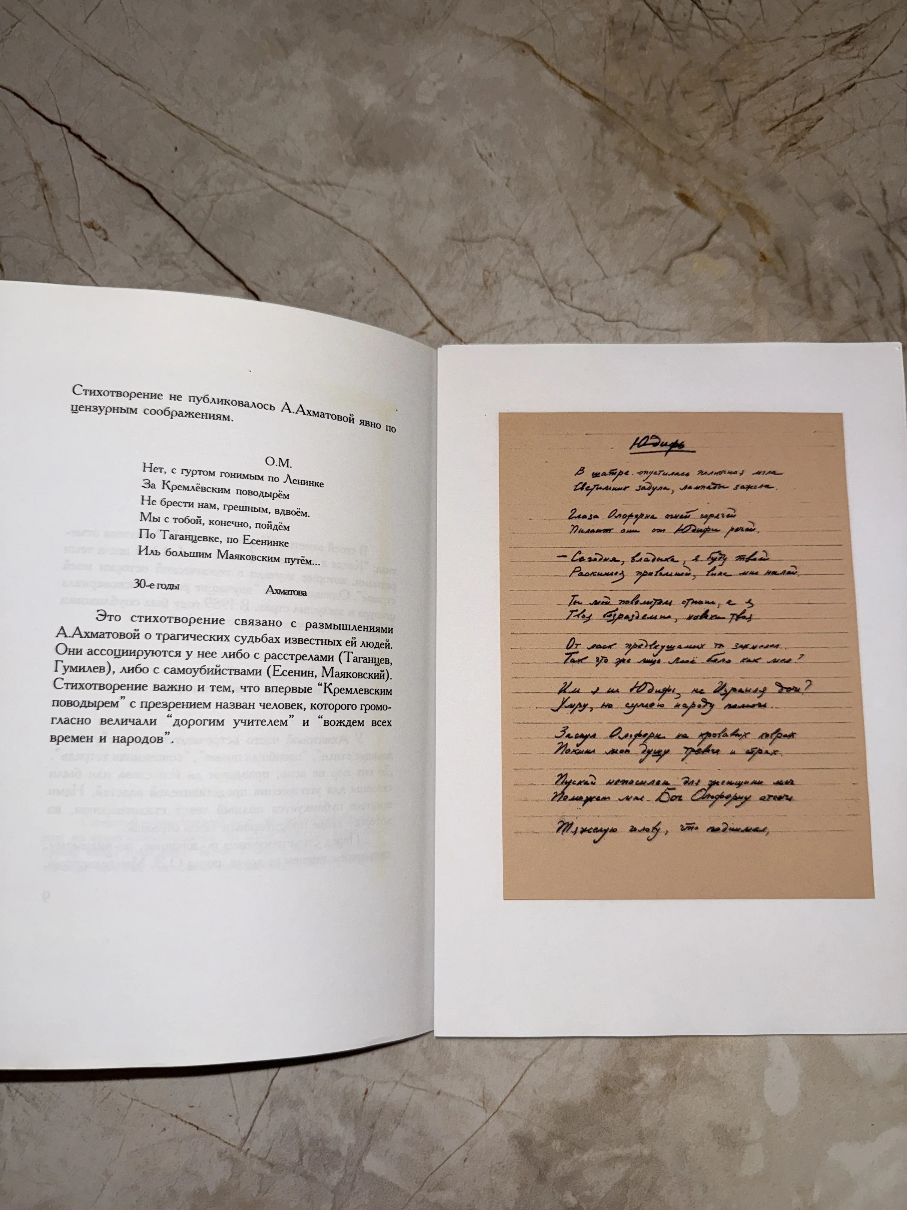 Разворот книги со стихотворением Анны Ахматовой «О.М.» и вклеенным факсимиле рукописи «Юдифь» на тонированной бумаге.