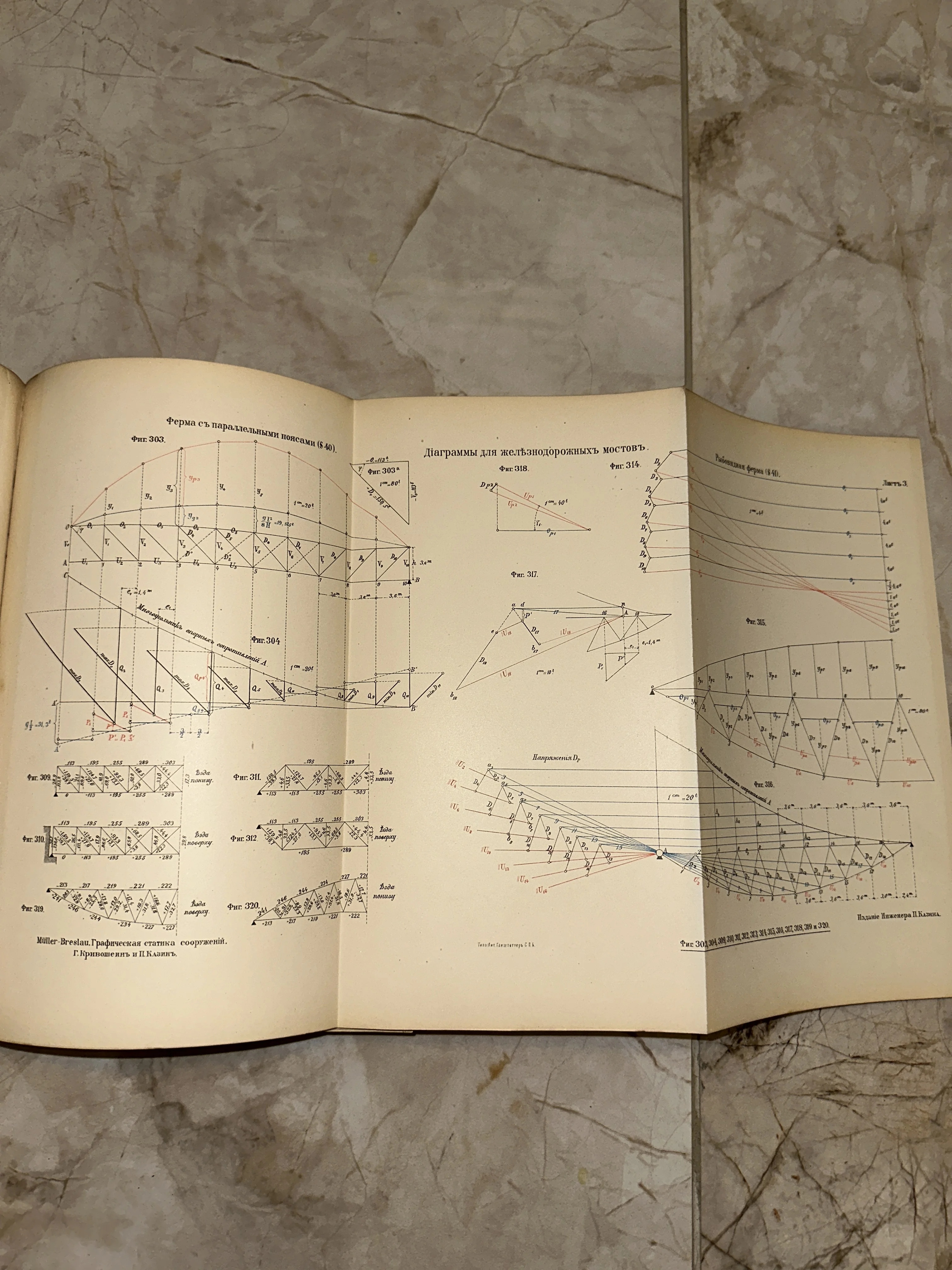 Уникальный документ эпохи расцвета инженерного дела — детальные диаграммы и схемы для проектирования железнодорожных мостов из курса графической статики. Страница сохранила дух времени: четкая дореволюционная типографика и филигранная прорисовка узлов ферм на благородной патине старой бумаги.