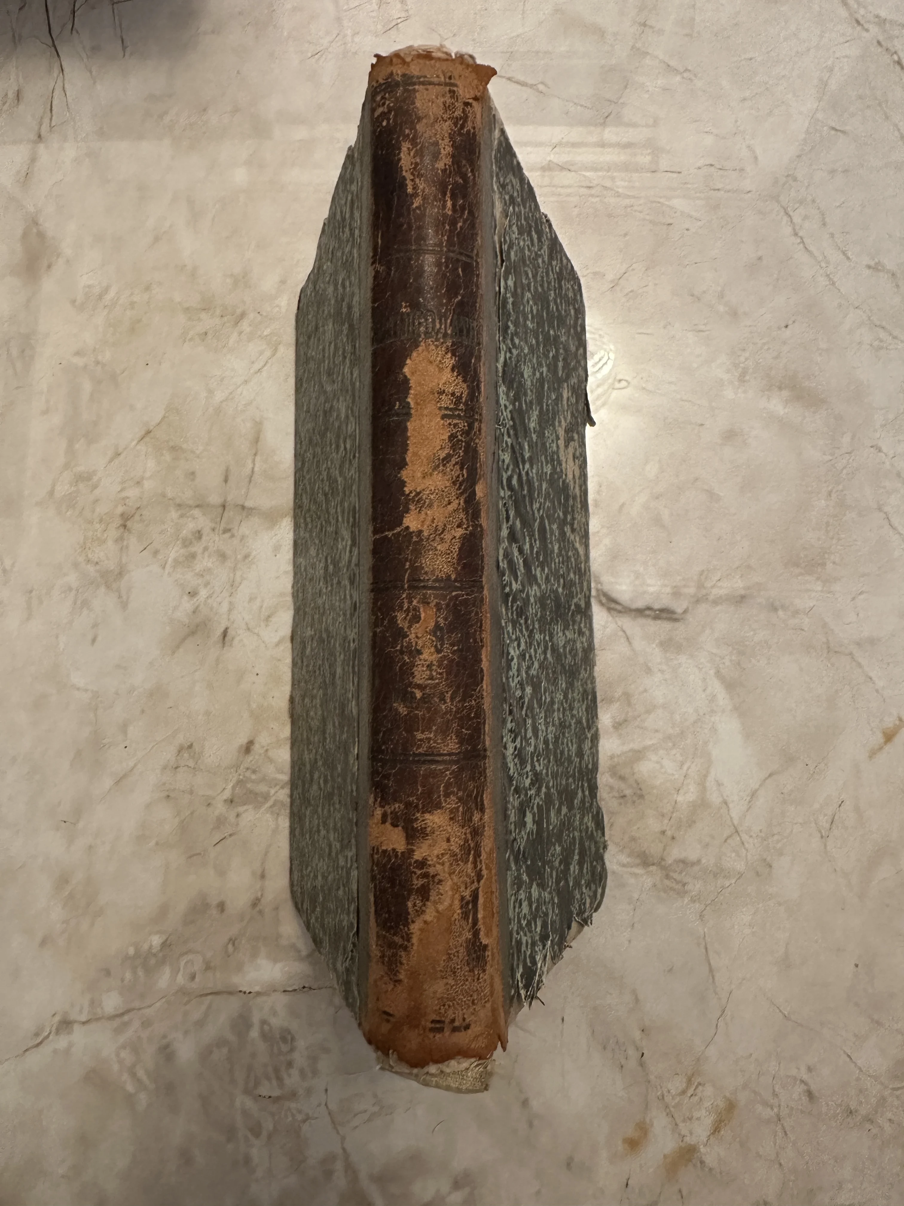 Вид сверху на сильно потертый кожаный корешок и мраморные боковины старинной книги на светлом фоне.